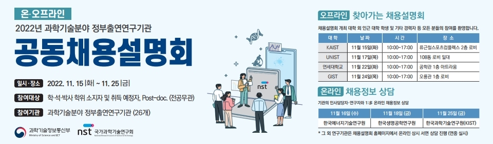 국가과학기술연구회와 소관 과학기술분야 25개 정부출연연구기관이 공동으로 「2022년도 과학기술분야 정부출연연구기관 온오프라인 공동채용설명회」를 아래와 같이 개최하니, 관심있는 학생들의 많은 참여 바랍니다.