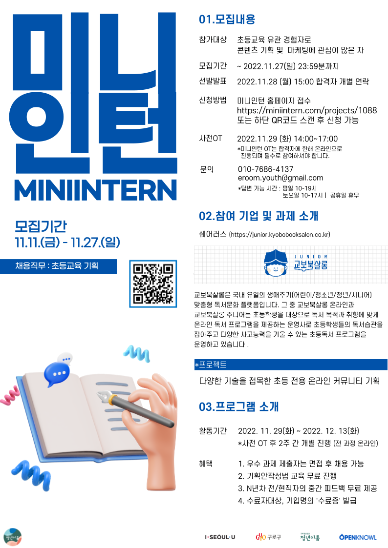 [미니인턴X쉐어러스] 실무 쌓고 취업할 사람 지금 당장 주목! 쉐어러스에서 초등교육 기획자 직무 인턴을 모집합니다. (~11/27)