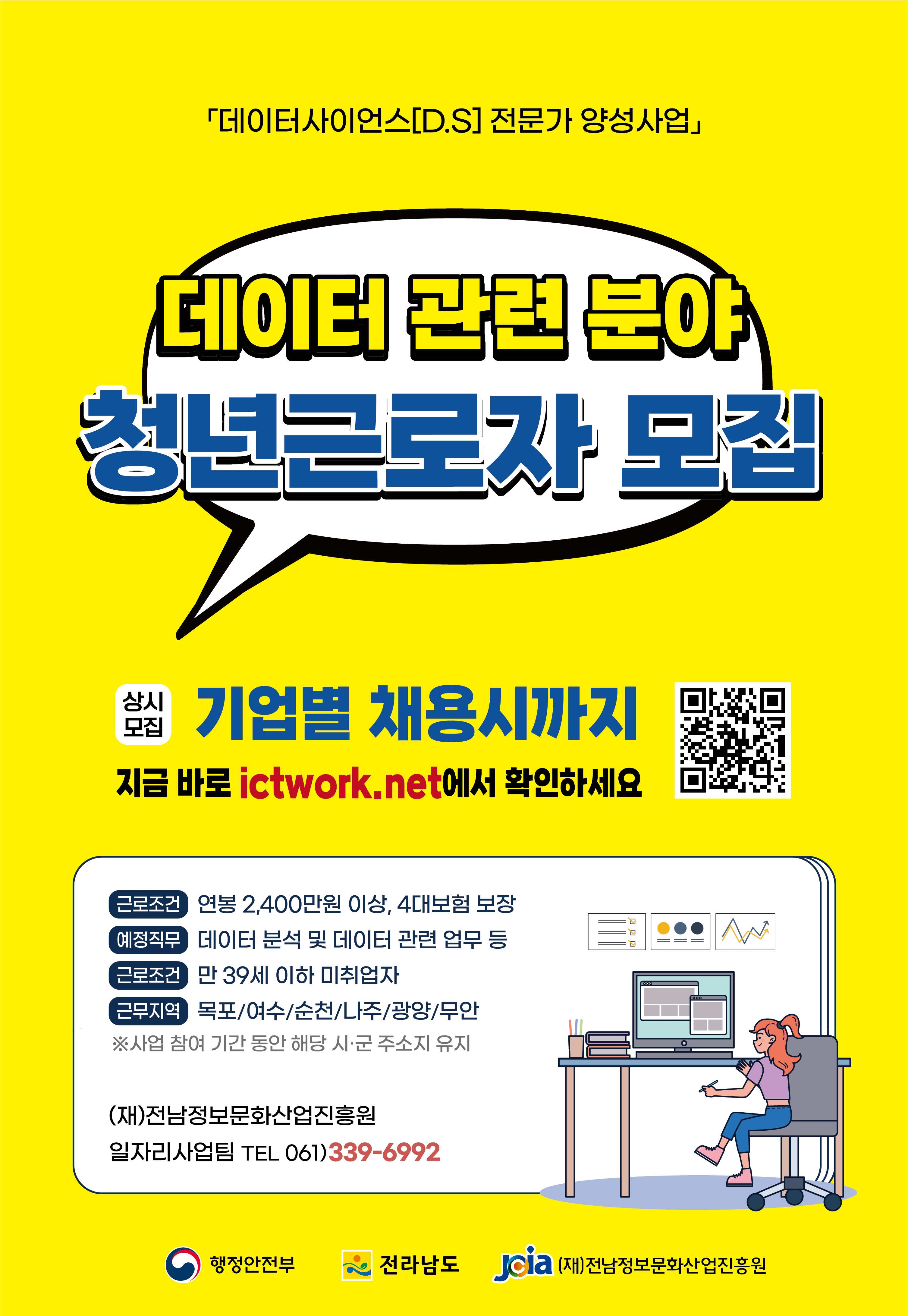 (재)전남정보문화산업진흥원에서는 ‘행정안전부 지역주도형 청년일자리 사업’의 일환으로「데이터사이언스(D.S) 전문가 양성사업」을 통해 ICT 관련 분야 일자리를 지원하고 있습니다.