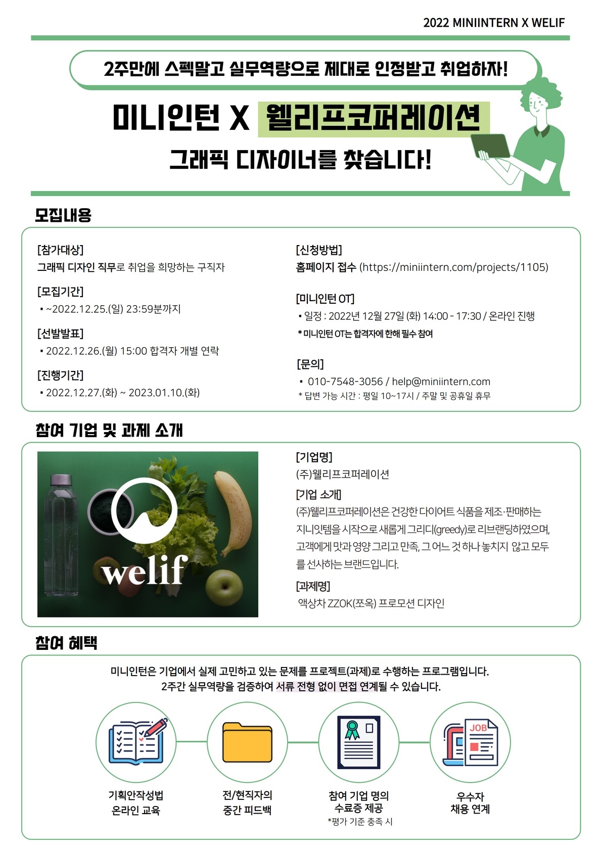 제목: [미니인턴x웰리프코퍼레이션] 내가 그래픽 디자인에 자신 있다면?! 실무 프로젝트 수행하고 '웰리프코퍼레이션'의 그래픽 디자이너로 취업해요!