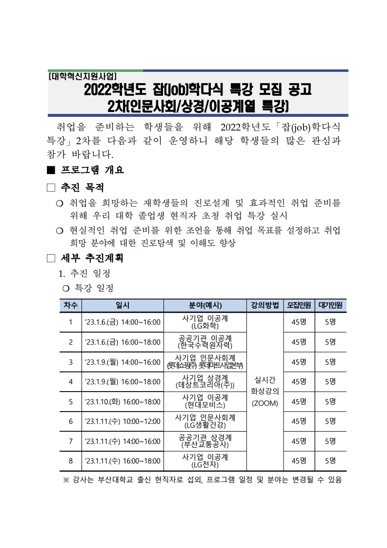 [잡(job)학다식 특강] 2022학년도 잡(job)학다식 특강 2차(인문사회/상경/이공계열 특강) 참가자 모집 안내