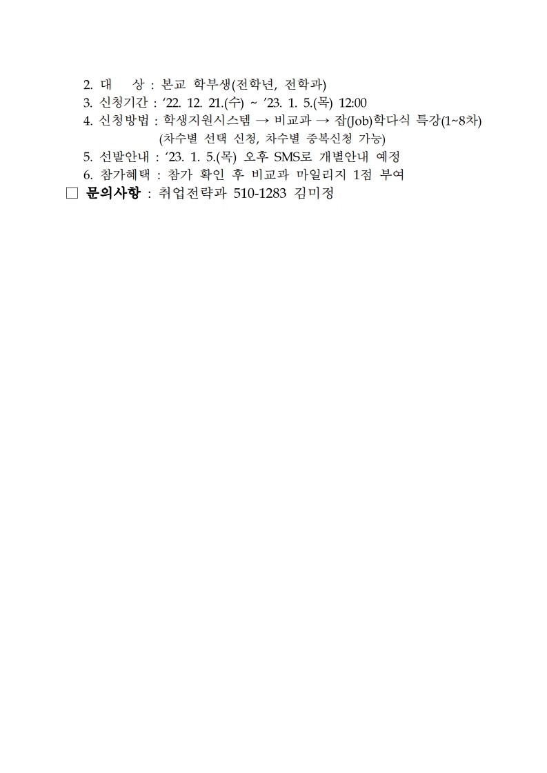 ✔ 신청방법 : 학생지원시스템 - 비교과 - 잡(job)학다식 특강(1~8차)