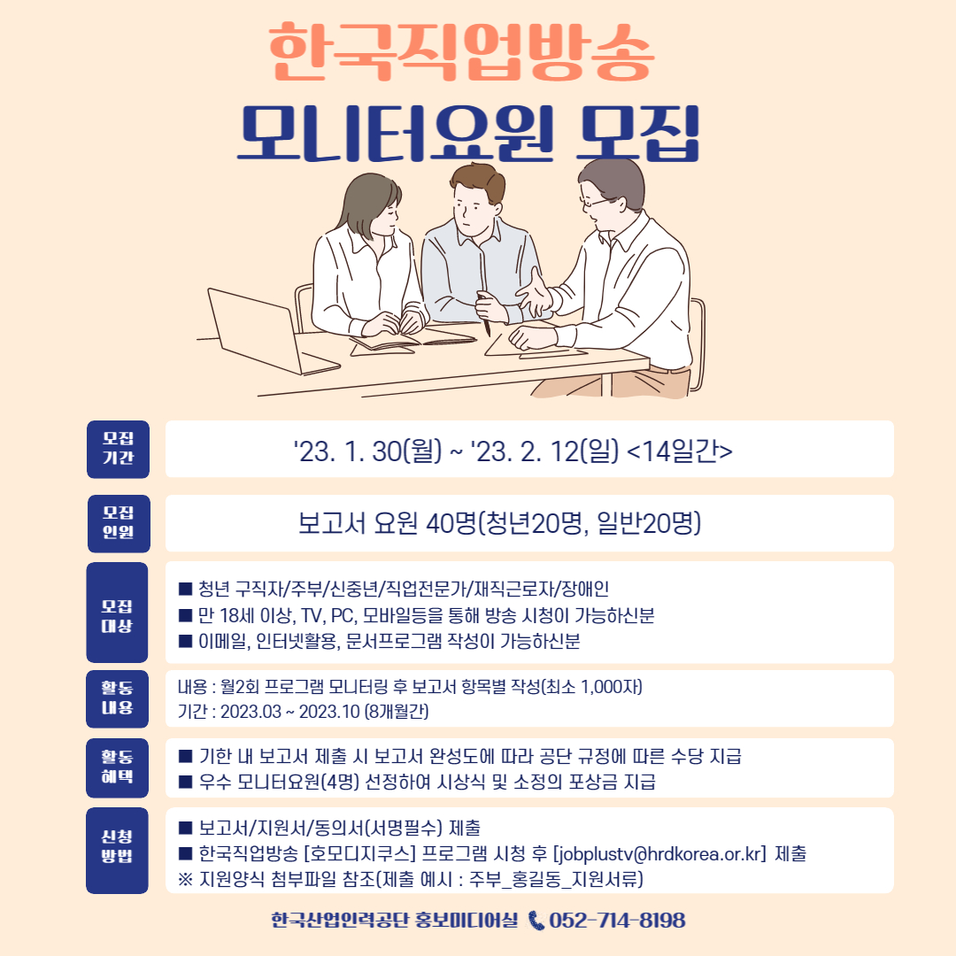 2023년 한국직업방송 모니터 요원 모집공고에 따라 역량있는 청년 모니터 요원을 붙임과 같이 모집하고자 합니다.