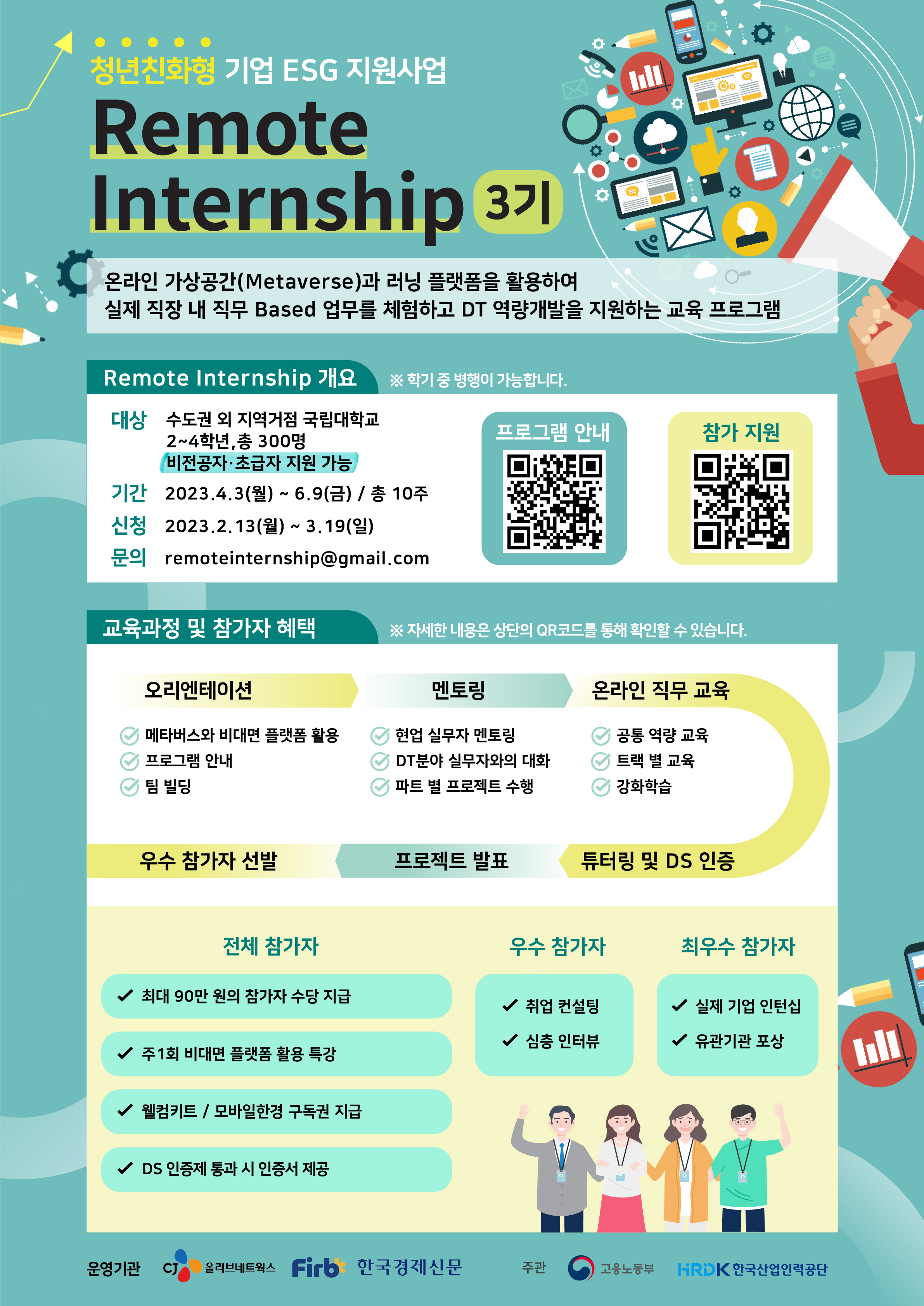 CJ올리브네트웍스 청년친화형 기업 ESG 지원 사업 ‘Remote Internship’ 프로그램 3기 참가자 모집을 아래와 같이 알려드리니, 관심 있는 학생들의 많은 지원 바랍니다.