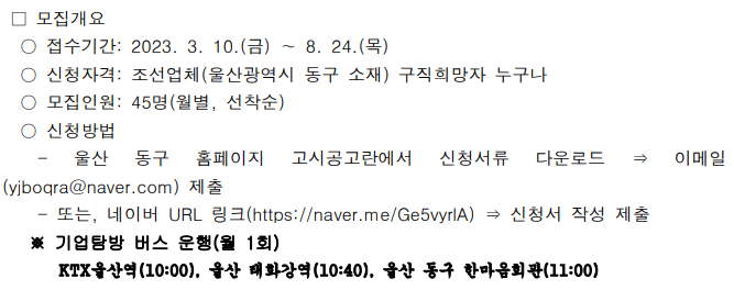 울산광역시 동구청에서 아래와 같이 「조선업 울산 기업탐방 및 취업설명회」 참여자를 모집하고 있으니, 관심 있는 분들의 많은 참여 부탁드립다.
