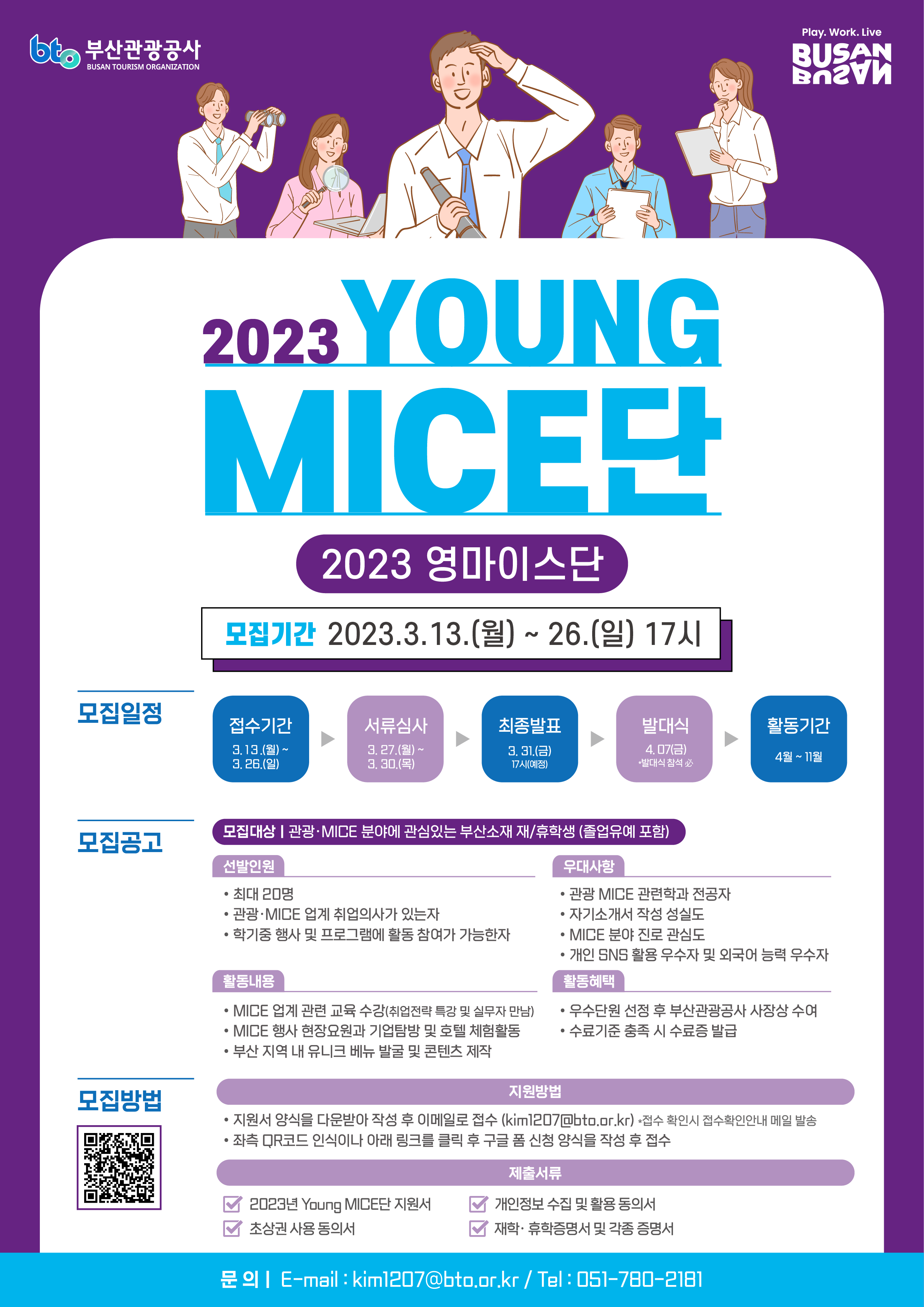 부산관광공사에서 지역 마이스(MICE) 인재 육성을 위하여 부산 소재 대학교 대학생을 대상으로 2023년 영마이스(Young MICE)단을 모집하고 있습니다. 관심 있는 학생들의 많은 참여 바랍니다.