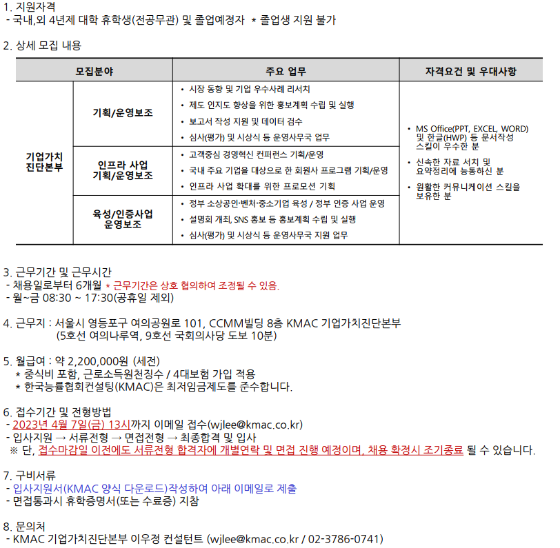 2023년도 KMAC 기업가치진단본부 PA(Project Assistant) 채용 안내