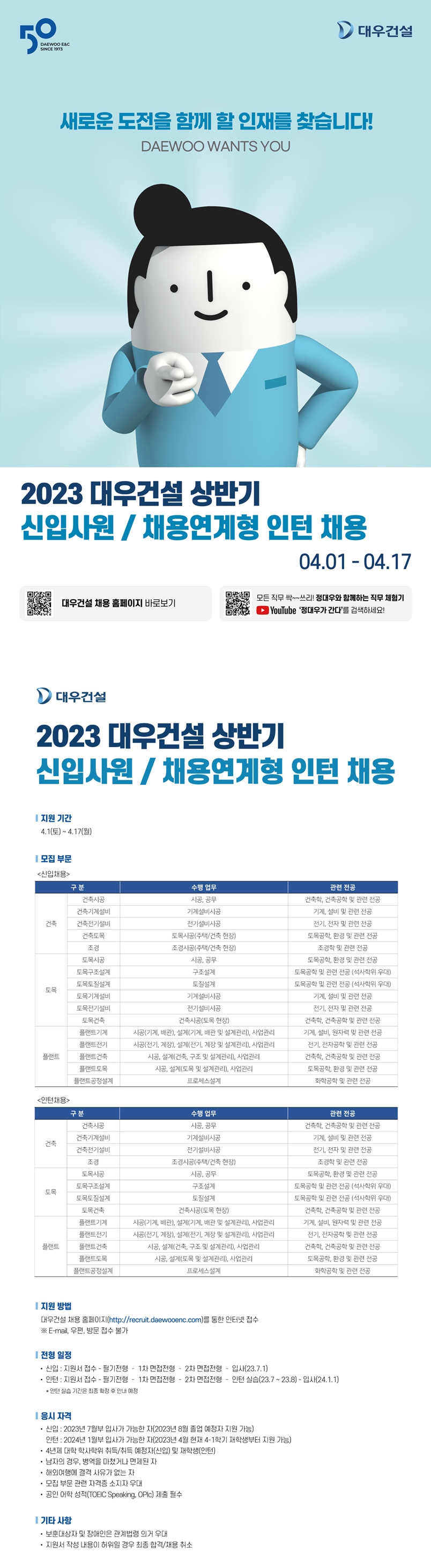 - 개요 : 대우건설 2023 상반기 신입사원/채용형 인턴 채용