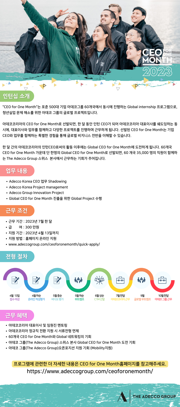 아데코코리아에서 CEO for One month (글로벌인턴십) 프로그램을 진행하오니 관심있는 분들의 많은 지원 바랍니다.