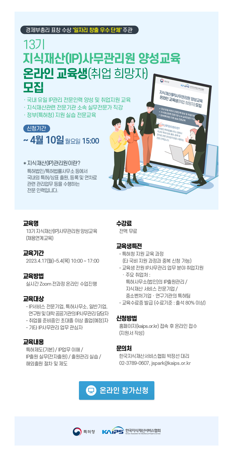 IP사무관리원 양성교육 13기 채용연계 온라인 교육생 모집 안내(~4/10)