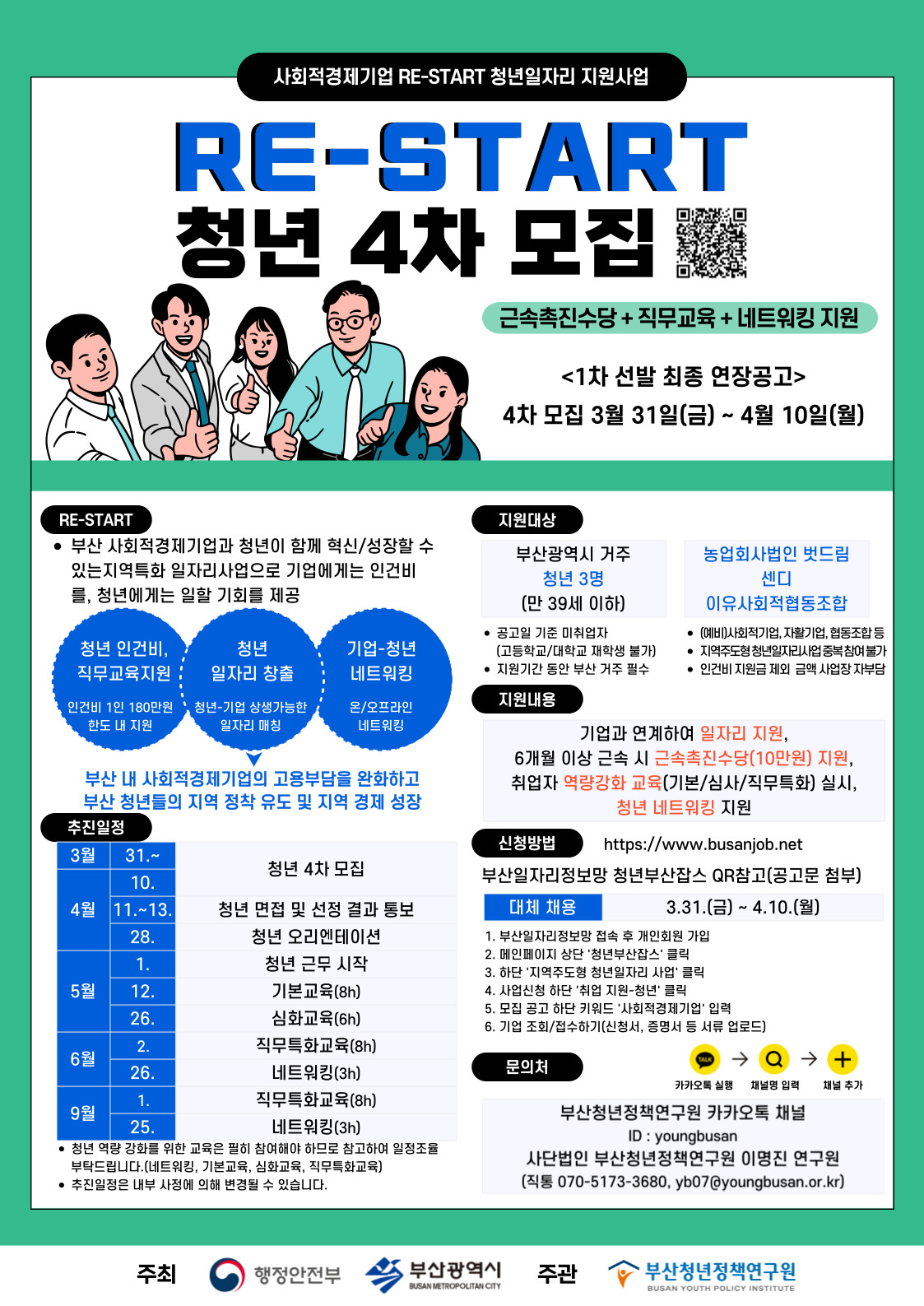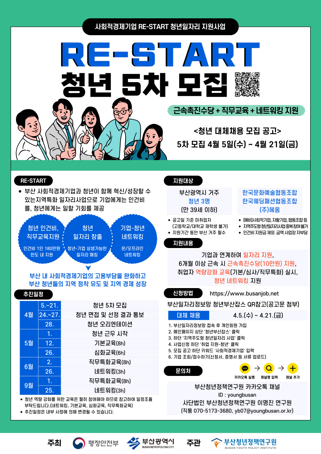 [부산청년정책연구원] 사회경제기업 RE - START 청년일자리 지원사업 4차, 5차 청년모집 홍보 관련 안내