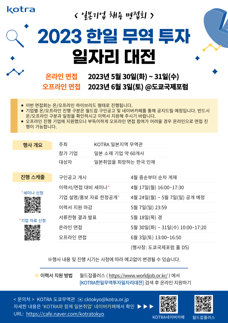 * 서류 지원 : 월드잡플러스(https://www.worldjob.or.kr/index.do) 에서 [KOTRA한일무역투자일자리대전] 검색 후 온라인 지원