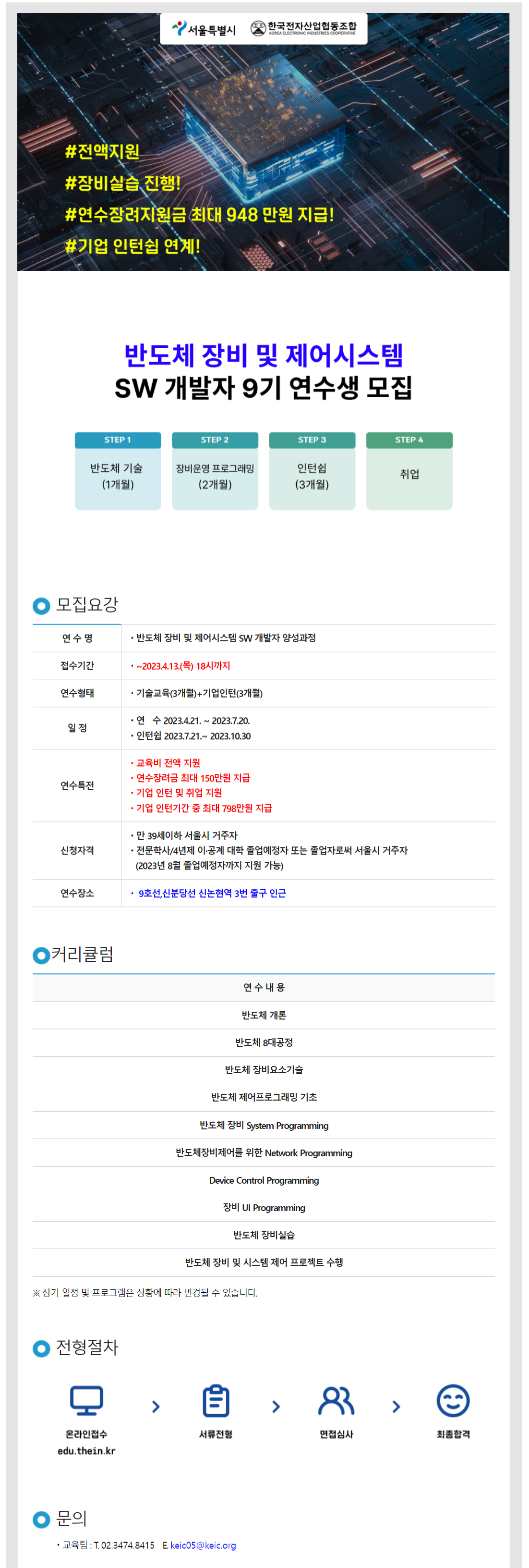 - 연수기간 : 2023년 4월 21일~2023년 10월30일 ( 전문교육 3개월+기업인턴쉽 3개월 )