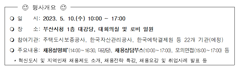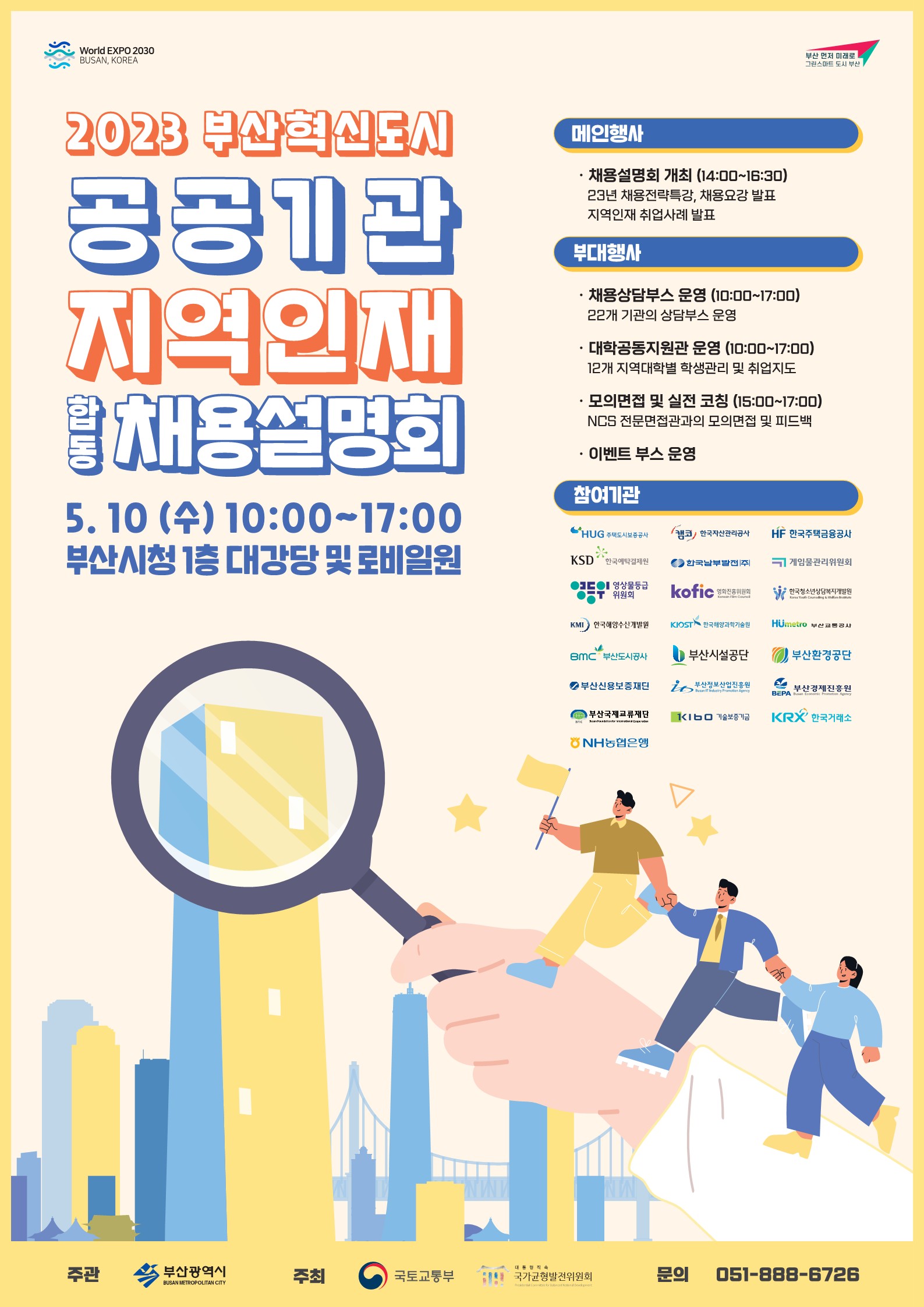 부산광역시에서 부산소재 공공기관 입사를 희망하는 지역인재들에게 채용정보를 제공하고자 「2023 부산혁신도시 공공기관 지역인재 합동채용설명회」를 아래와 같이 개최함을 알려드리니, 관심 있는 학생들의 많은 참여 바랍니다.
