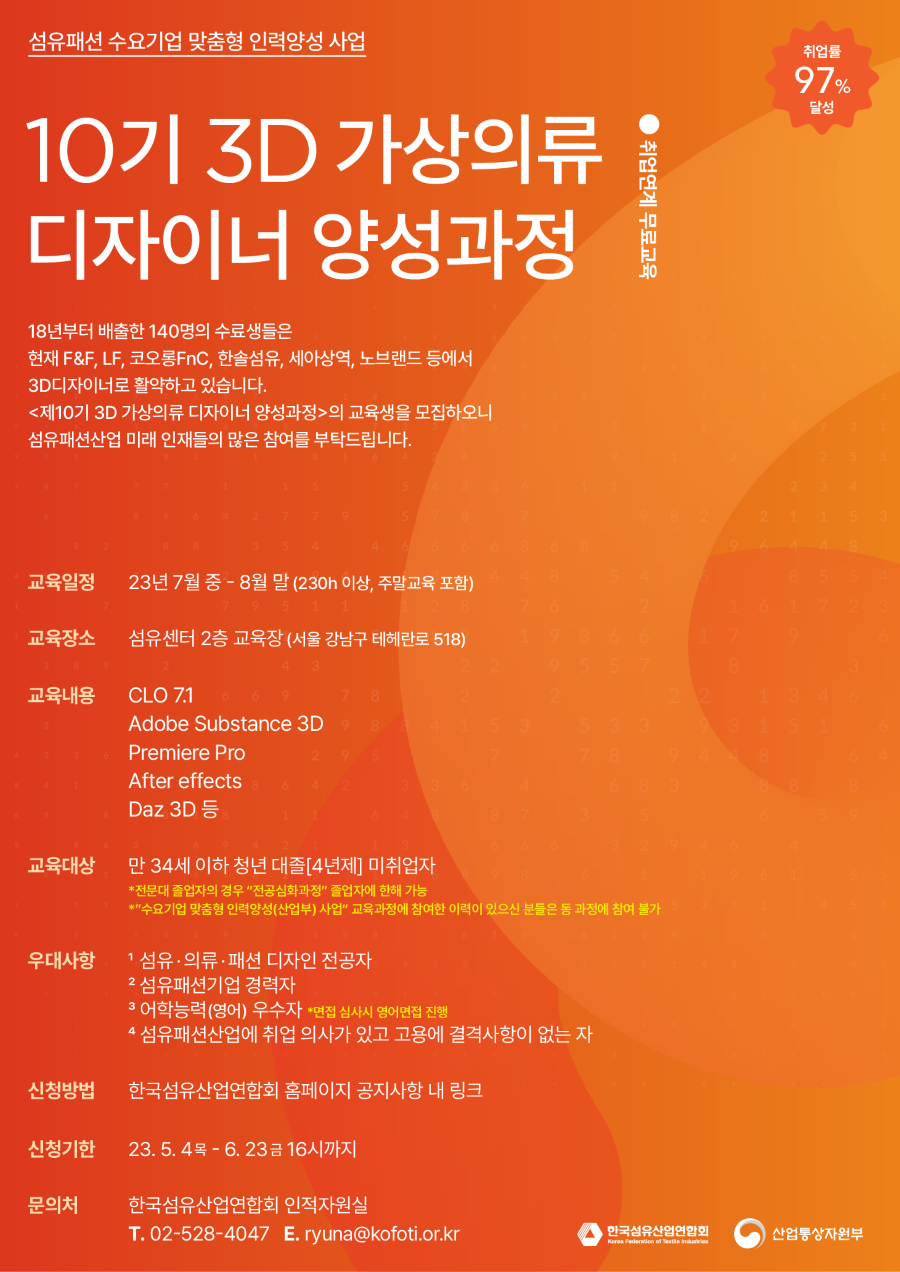 한국섬유산업연합회에서 <제10기 3D 가상의류 디자이너 양성과정>의 교육생을 모집하오니 관심있는 분들의 많은 지원 바랍니다.