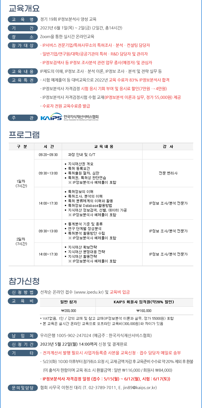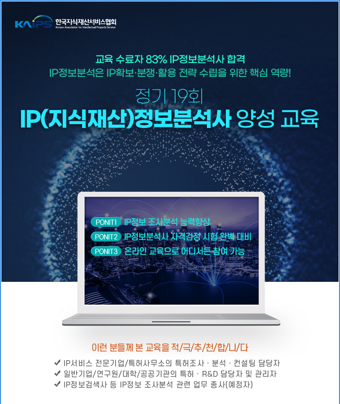 [KAIPS] 정기 19회 IP정보분석사 양성교육 시행 및 접수 안내(~5/22)