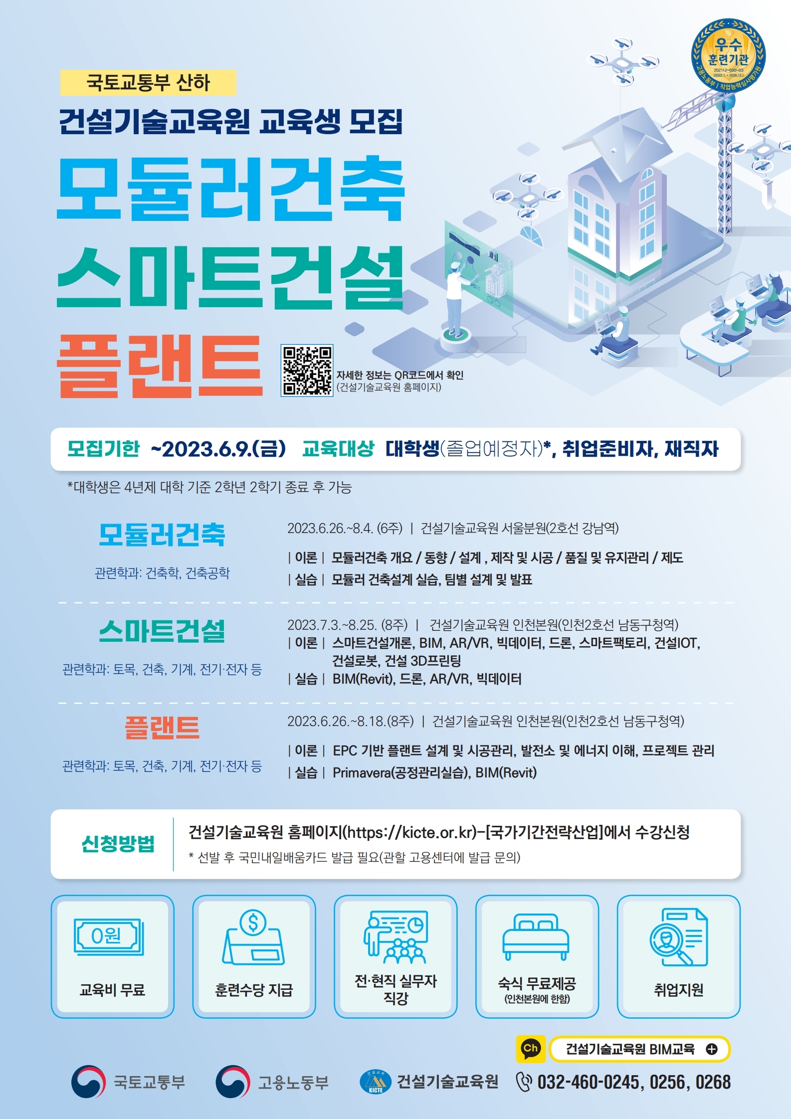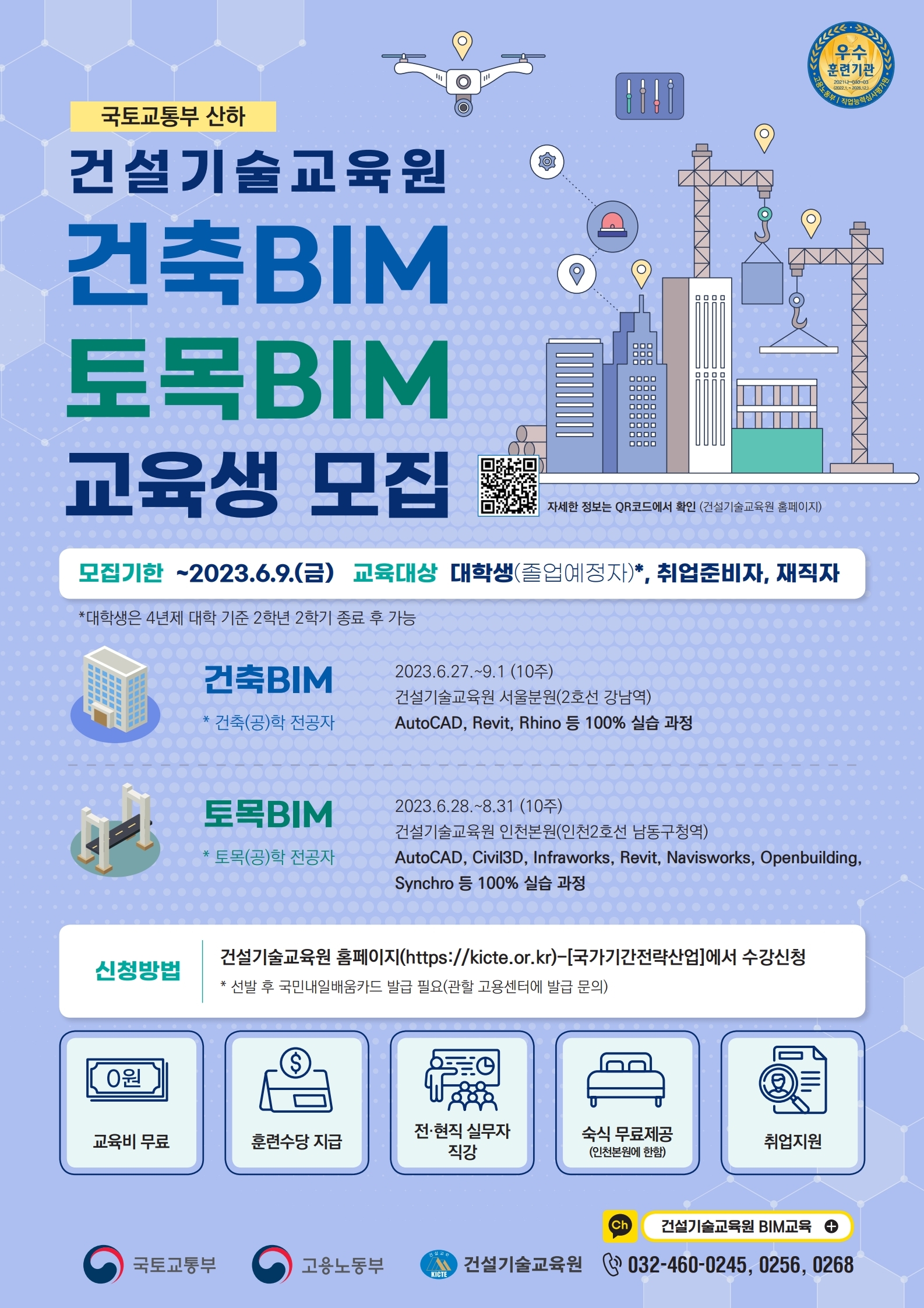 국토교통부 산하 공공기관인 건설기술교육원에서는 국토교통부, 고용노동부와 함께 청년실업 해소 및 예비 건설기술인 양성을 위한 전문인력 양성교육을 국비(무료)로 실시하고 있습니다.