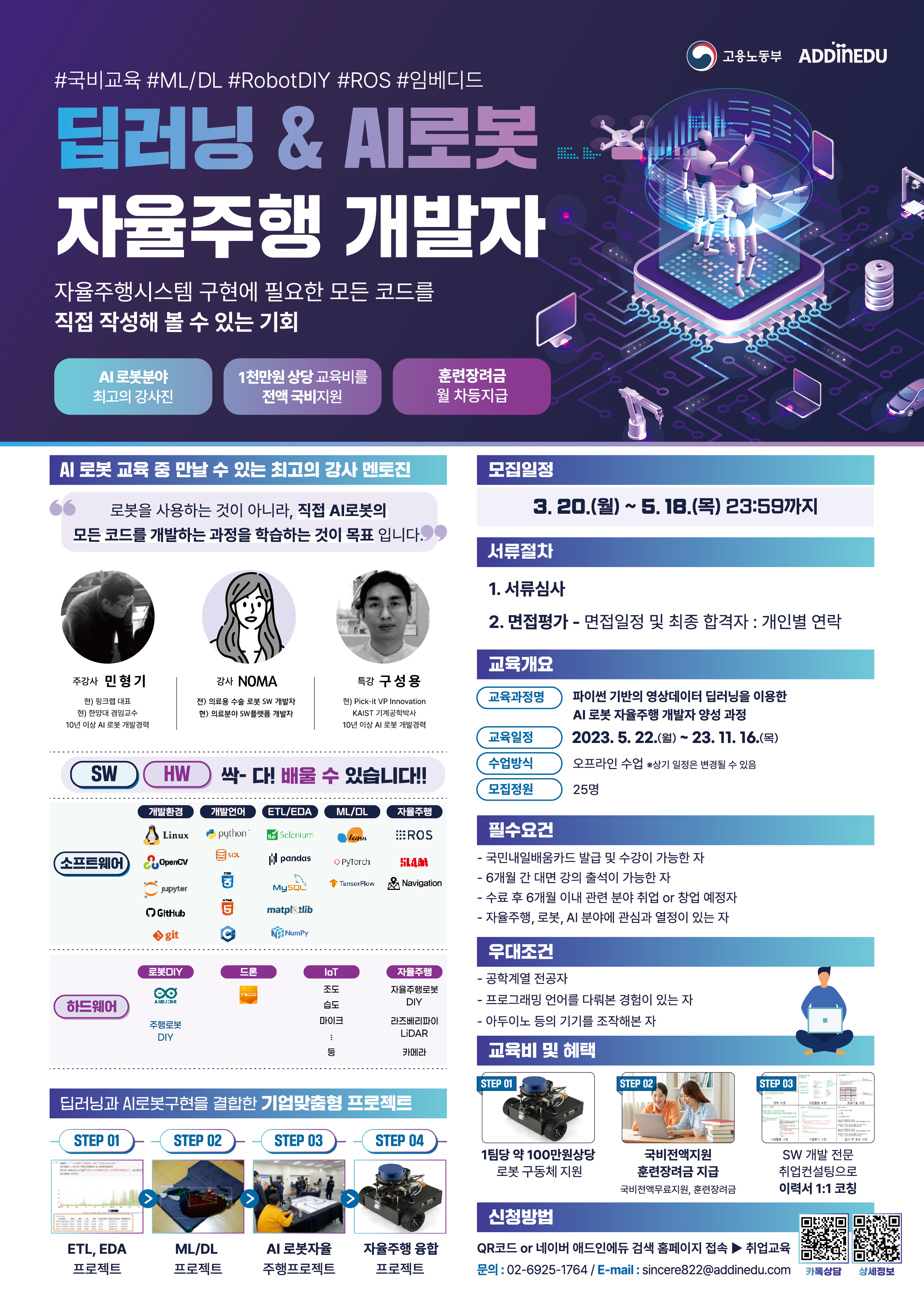 에듀인에듀에서 영상인식, 무인이동체, 협동로봇 분야로 취업을 희망하는 열정넘치는 학생들을 대상으로 진행하는 하기의 교육과정을 2023년 05월 22일부터 가산디지털단지에서 국비지원으로 진행할 예정이오니, 관심있는 분들의 많은 지원 바랍니다.