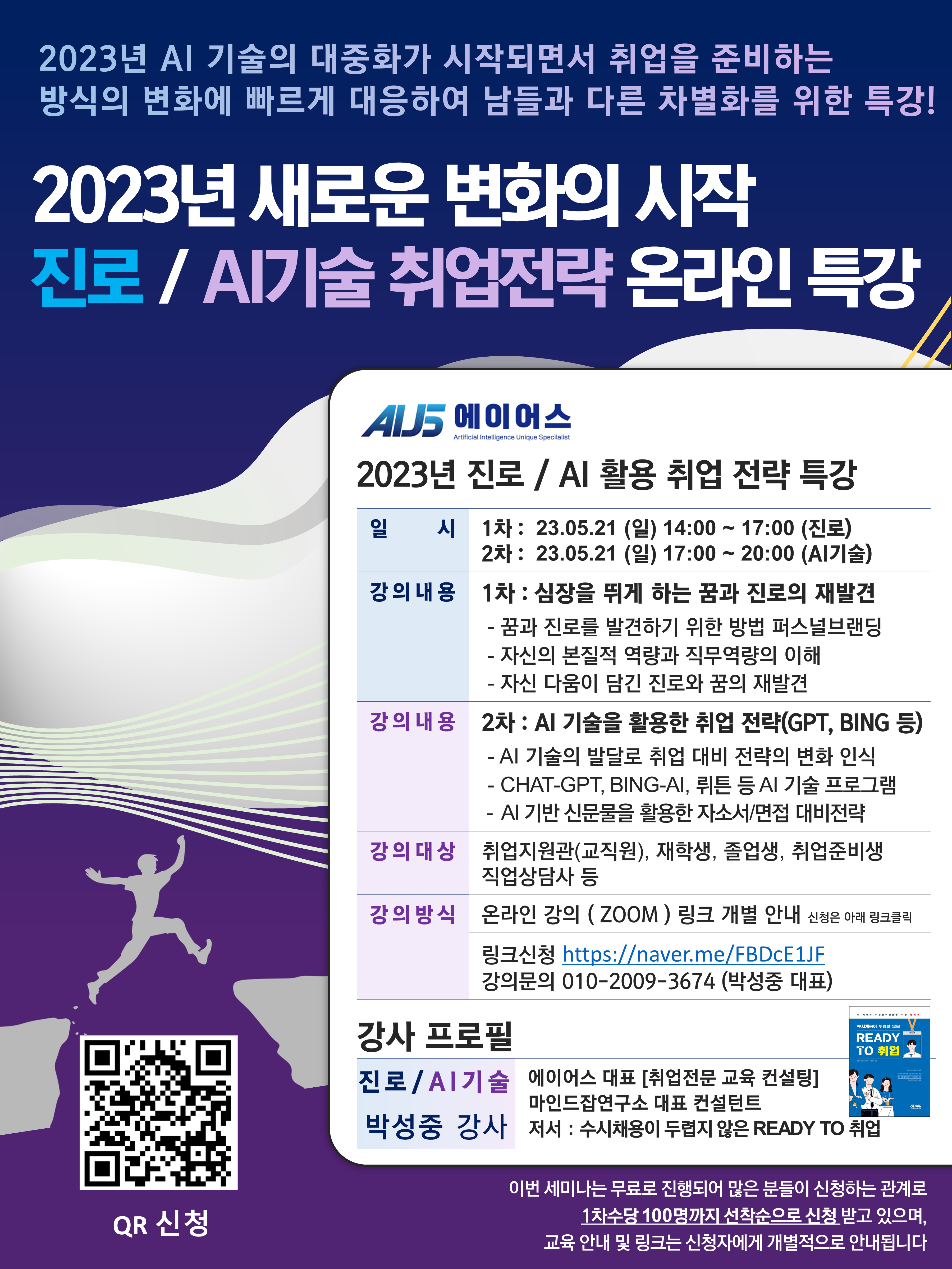진로/AI기술을 활용한 취업 전략 온라인 5월 에이어스 특강 (5.21 - 일 14시, 17시)