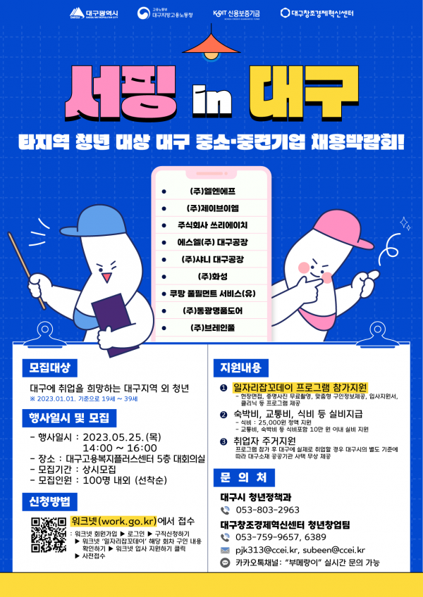 대구광역시와 대구지방고용청, 신용보증기금은 타지역 청년을 대상으로「대구의 우수 중소·중견기업 채용박람회」를 개최하오니, 관심있는 분들의 많은 참여 바랍니다.