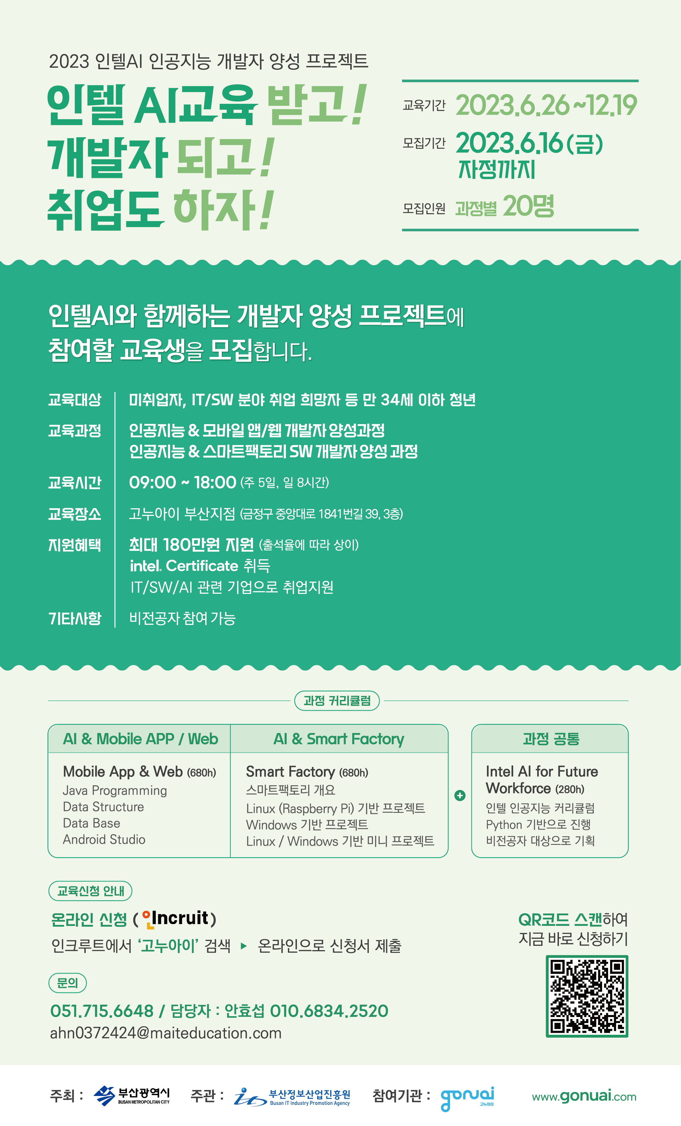 인공지능 교육기관 (주) 고누아이에서 부산시 주최, 부산정보산업진흥원 주관의 '2023 인텔AI 인공지능 개발자 양성 프로젝트'를 진행하오니, 관심있는 분들의 많은 지원 바랍니다.