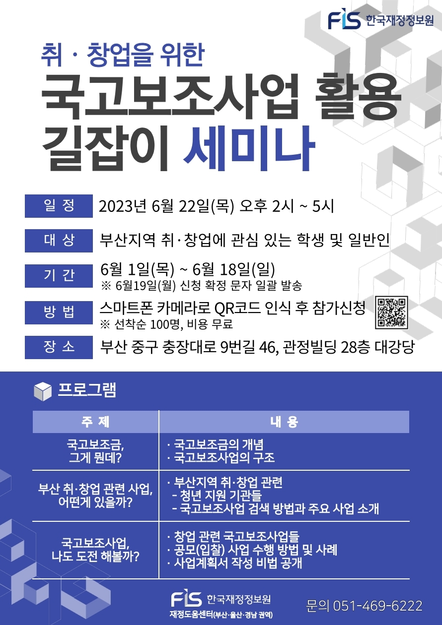 [한국재정정보원] 취·창업을 위한 국고보조사업 활용 길잡이 세미나 안내(6/22)
