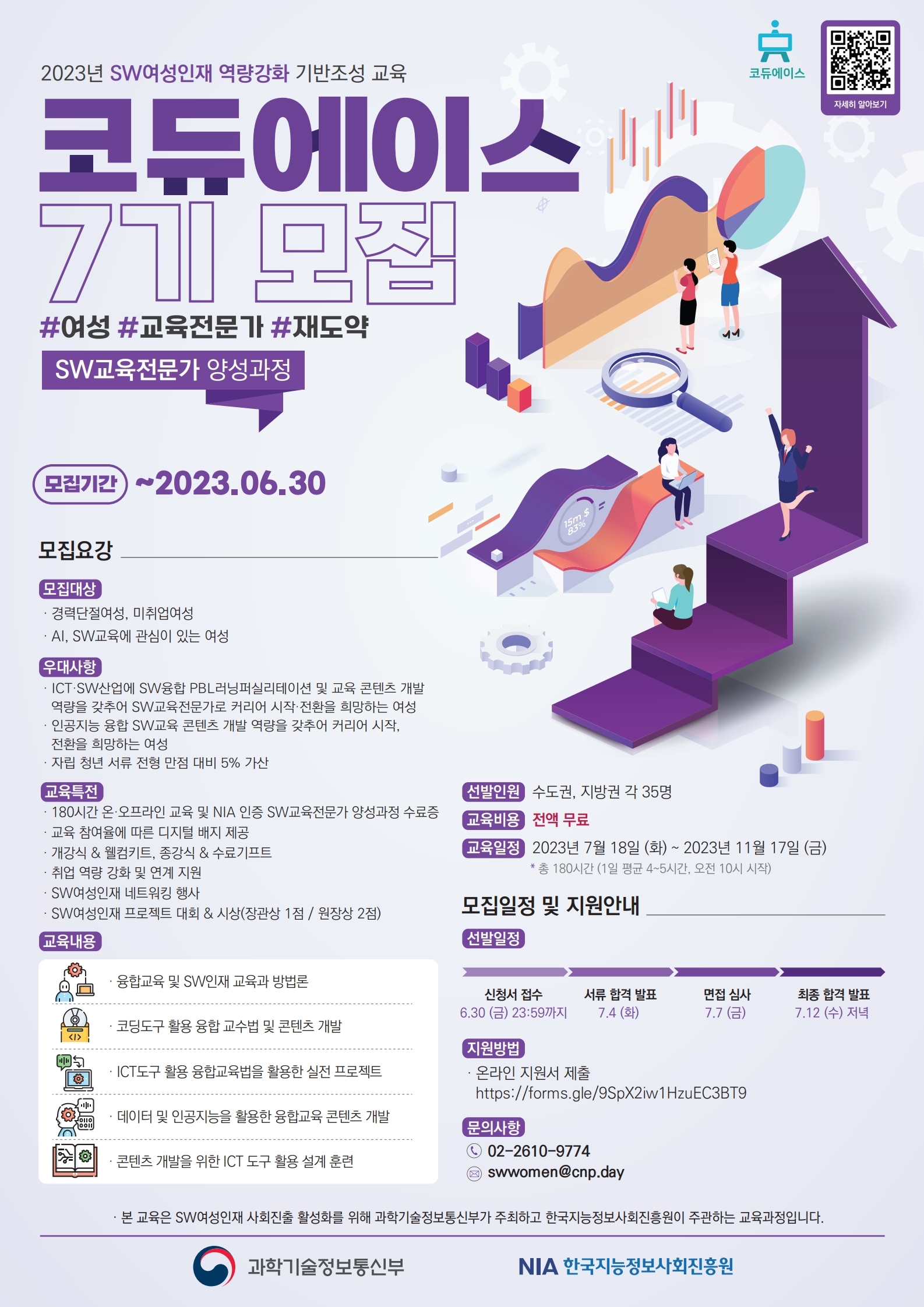과학기술정보통신부와 한국지능정보사회진흥원에서는 SW여성인재 양성과 사회진출을 위해 'SW여성인재 역량강화 기반조성'사업의 일환으로 아래와 같이 취업역량교육을 진행하오니, 관심있는 분들의 많은 지원 바랍니다.