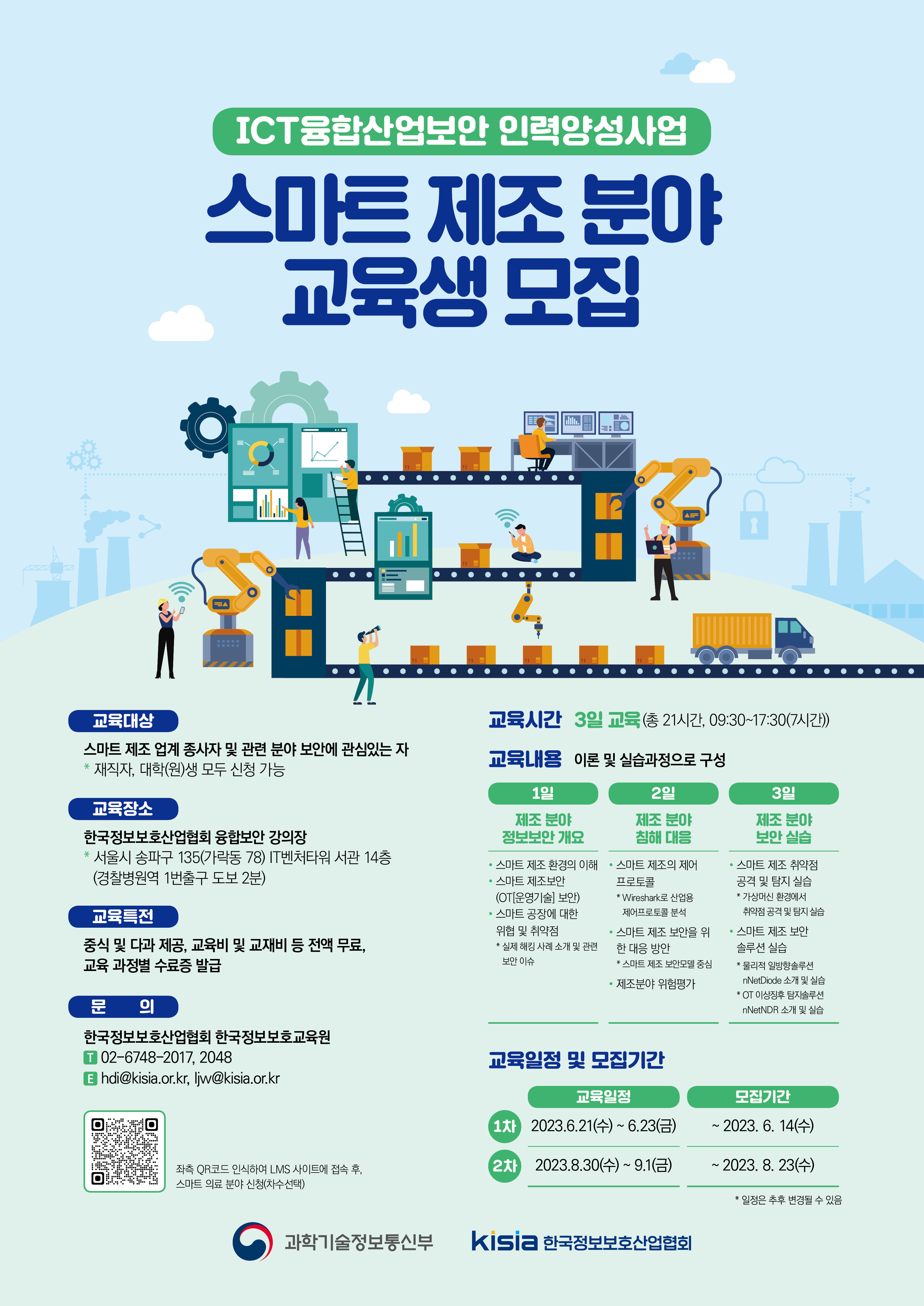 과학기술정보통신부 주최로 <ICT융합산업보안 인력양성사업>을 운영하고 있사오니, 관심있는 분들의 많은 지원 바랍니다.