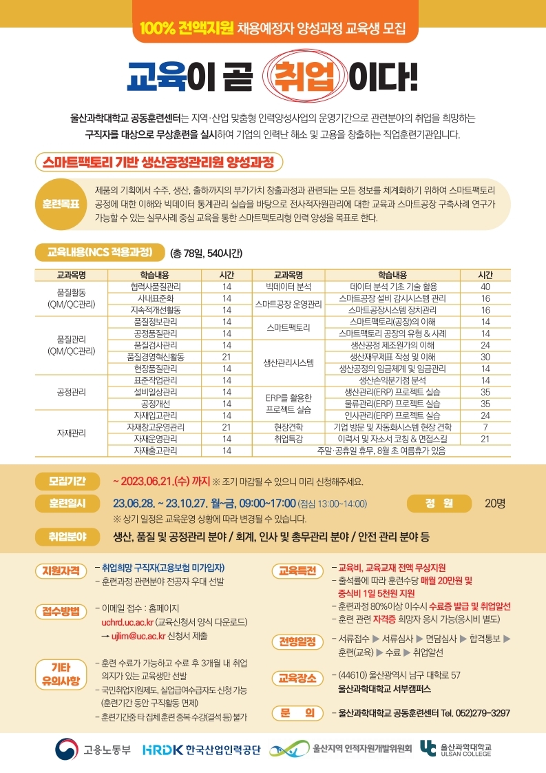 울산과학대학교 공동훈련센터 100% 국비지원 채용예정자 양성과정 안내