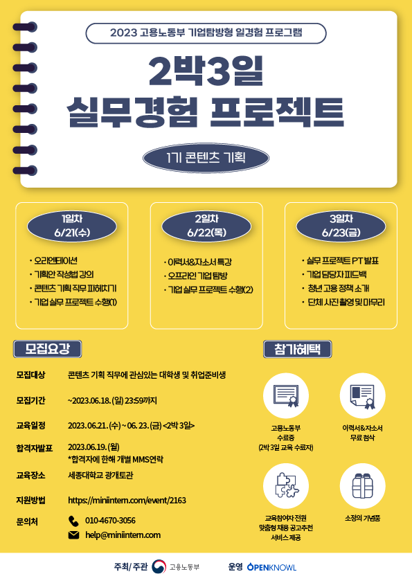[고용노동부] 직무 특강부터 실무 체험까지 담은 '2박 3일 실무 경험 프로젝트 1기 모집 중!' (~06/18)