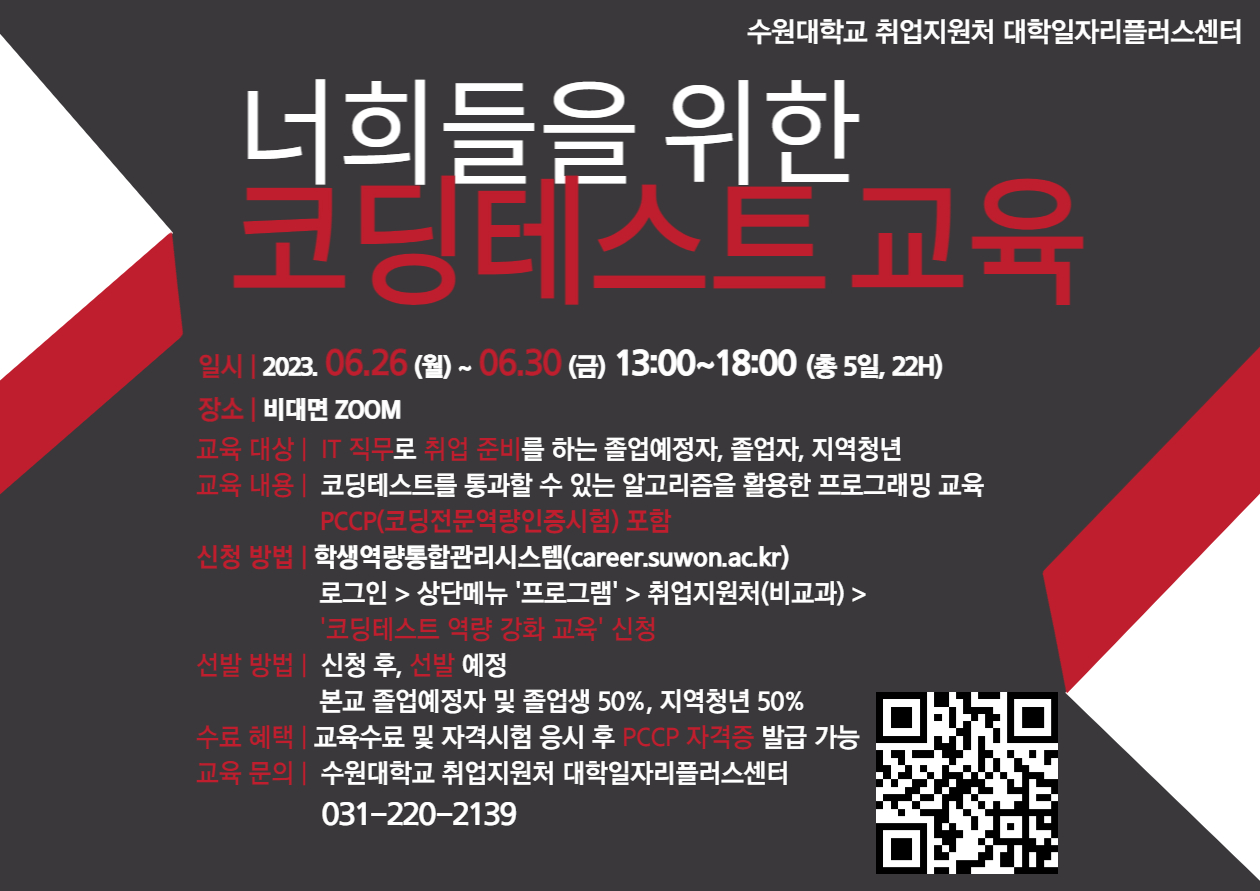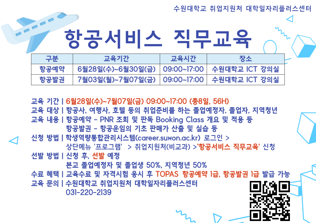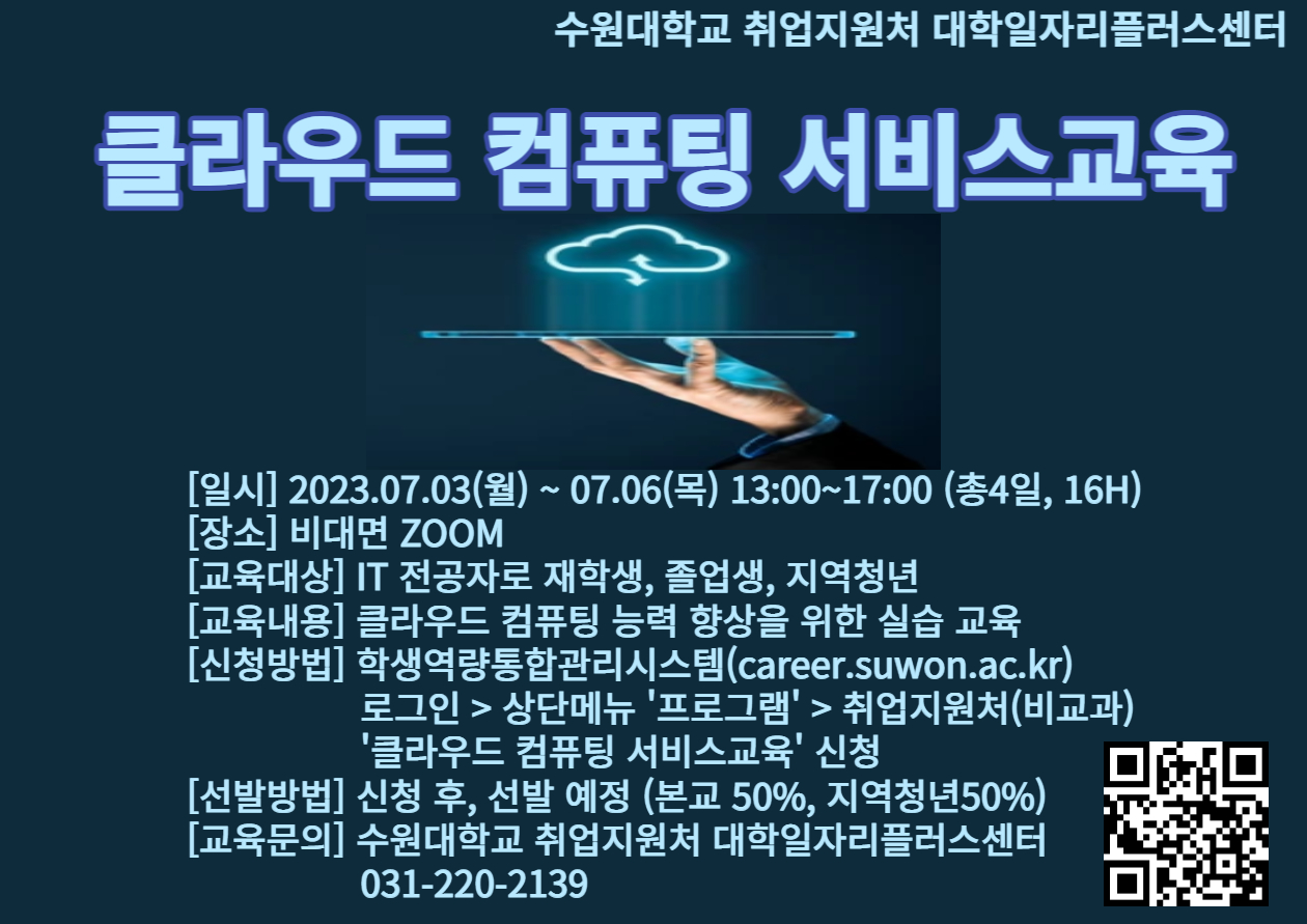 수원대학교 대학일자리플러스센터에서 거점형프로그램으로 코딩테스트교육(비대면)/클라우드컴퓨팅 서비스교육(비대면)/항공서비스 직무교육(대면)을 진행할 예정이오니, 관심있는 분들의 많은 지원 바랍니다.