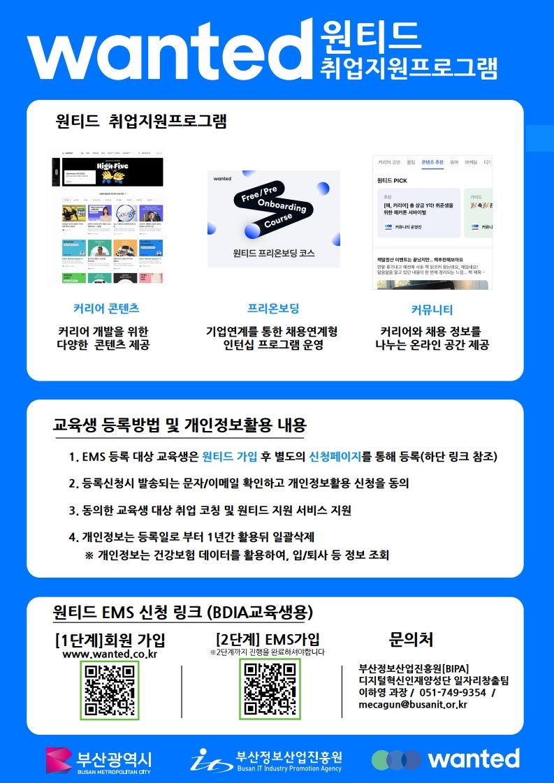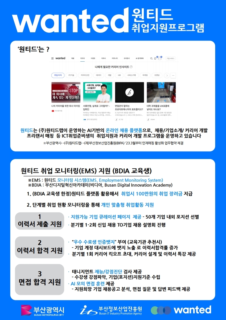 * 협약내용 : (주)원티드랩은 BDIA 수료생이 원티드랩 플랫폼(원티드)을 통해 기업에 취업되는 경우 취업특별 장려금 100만원(기존, 50만원) 지급 및 BDIA 수료생을 채용하는 부산기업에는 채용수수료(기존, 연봉의 7%) 면제 ※ 단, 부산정보산업진흥원 지원기업에 한함.