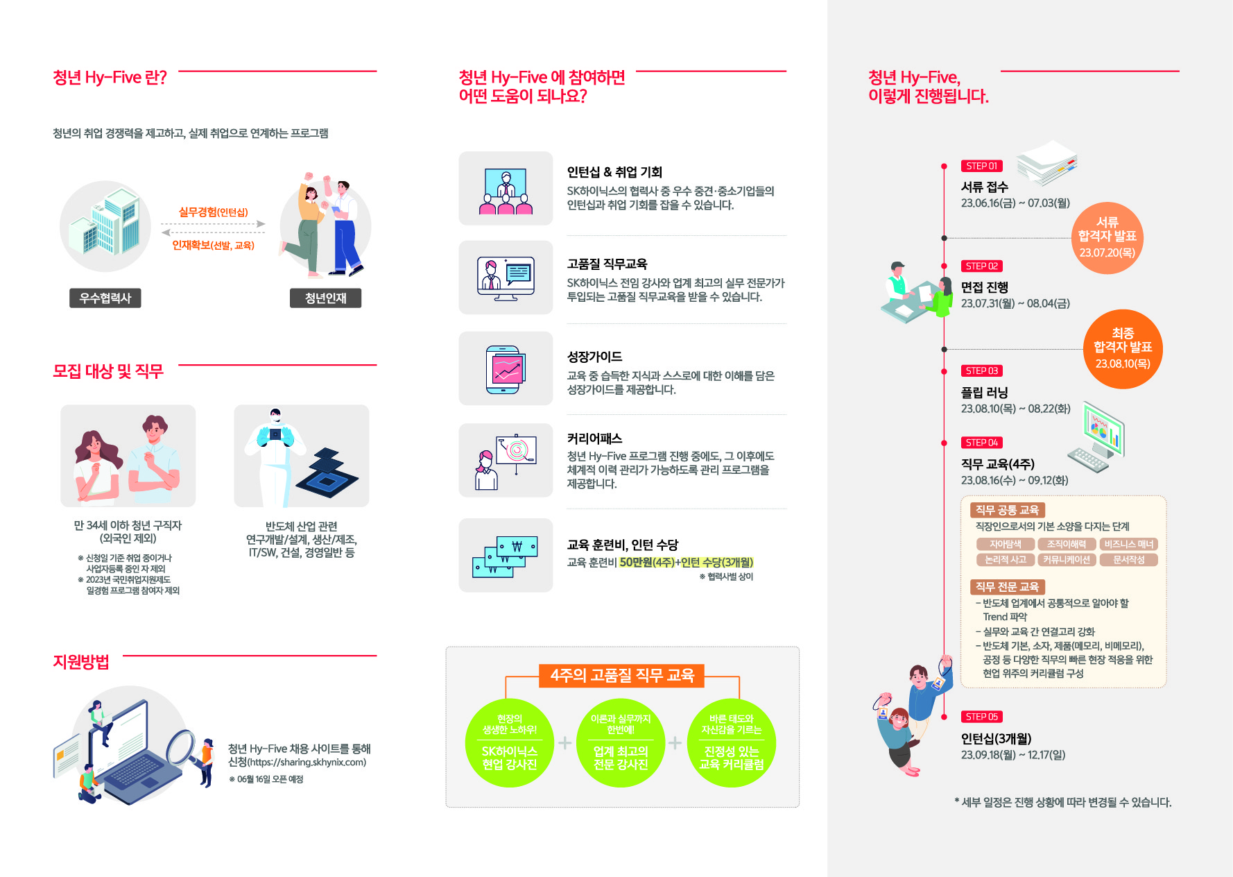 청년 Hy-Five는 SK하이닉스의 인프라를 활용하여 청년 구직자에게 양질의 교육 훈련을 실시하고 우수 협력사 취업 연계를 통하여 청년실업 해소를 목적으로 하고 있습니다.
