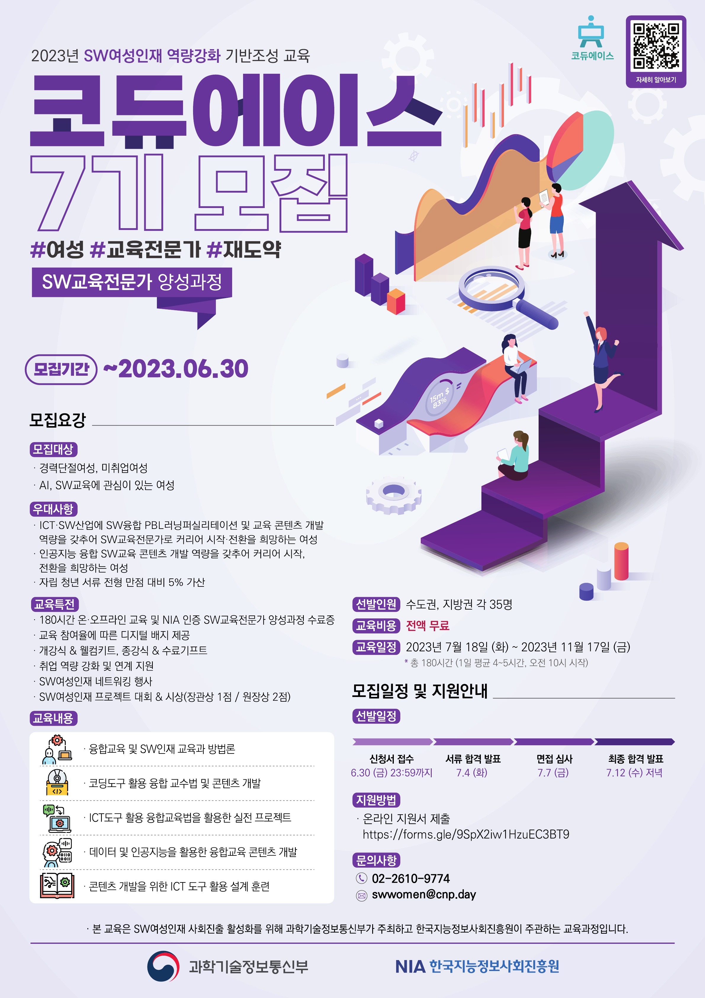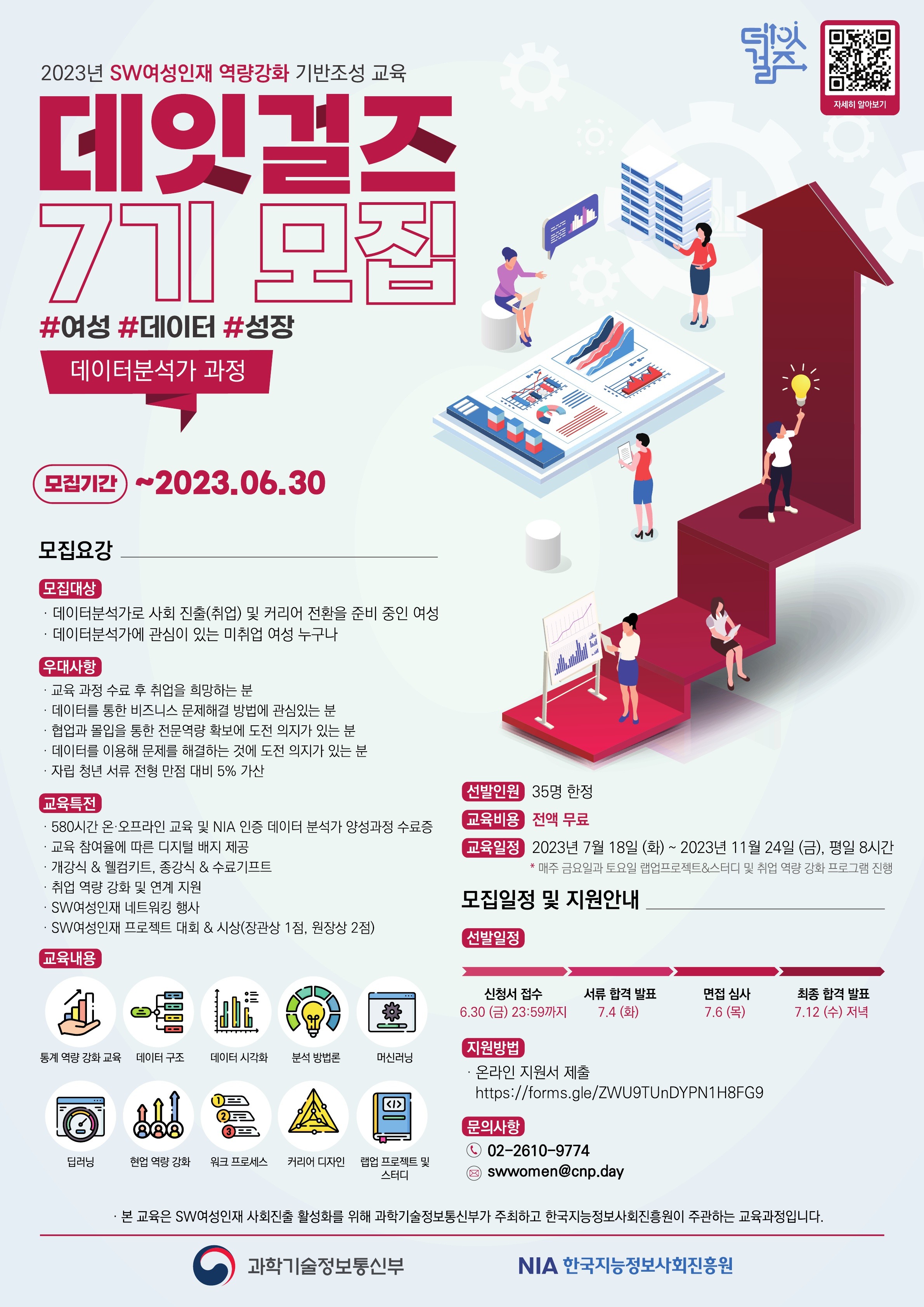 데이터분석가 과정 "데잇걸즈 7기"와 SW교육전문가 과정 "코듀에이스 7기" 교육생을 모집합니다.