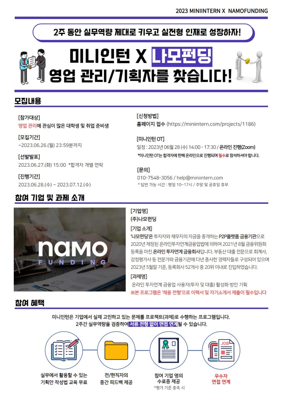 [미니인턴X나모펀딩] 온라인 투자연계 금융회사 <나모펀딩>의 실무 과제 수행하고 영업 직무에 취업하자!
