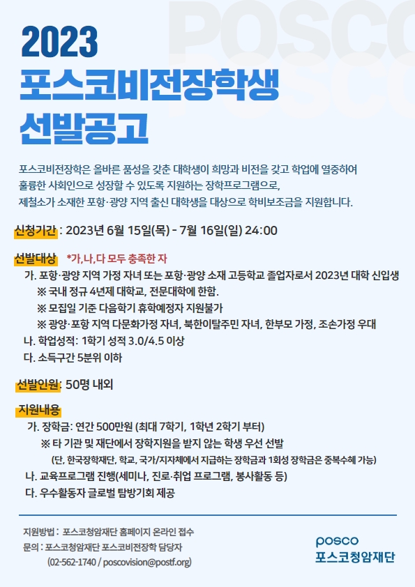 2023 포스코비전장학 선발공고 (지원기간 ~7.16)