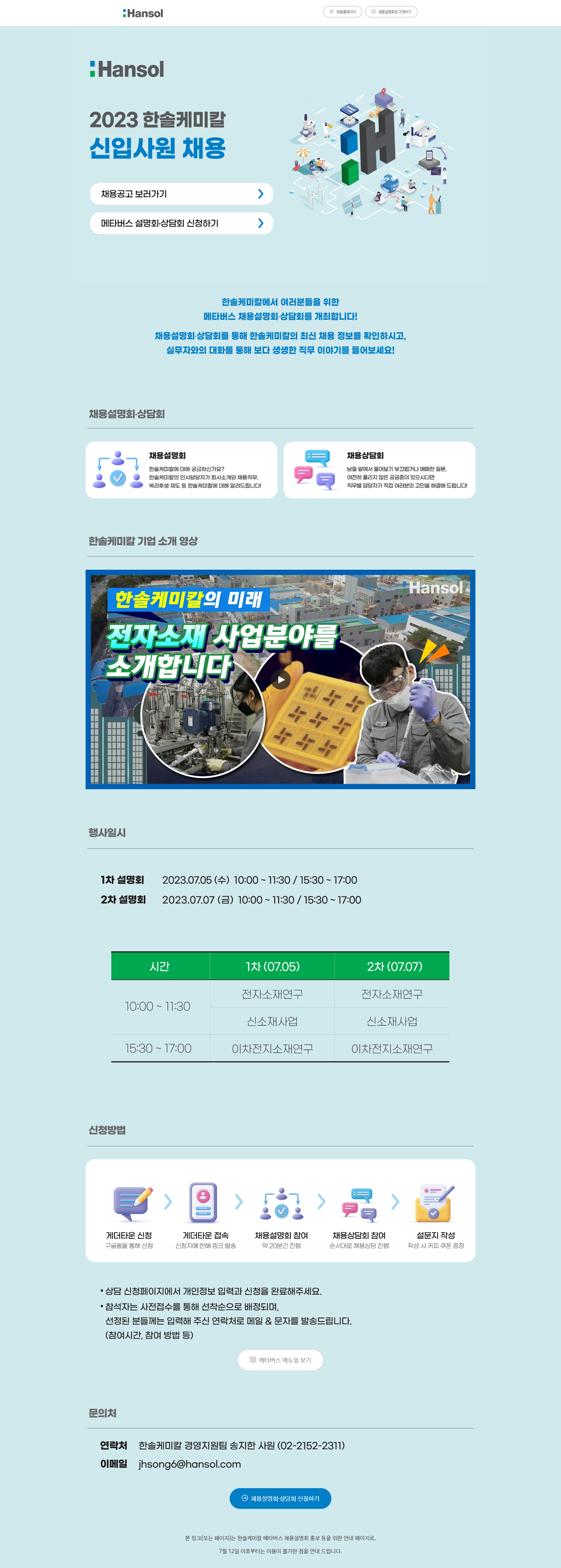 상담 직무 시간 확인 및 상담 신청 등 자세한 내용은 아래 한솔케미칼 채용설명회 페이지를 통해 확인 가능하오니 많은 관심과 신청 부탁드립니다.