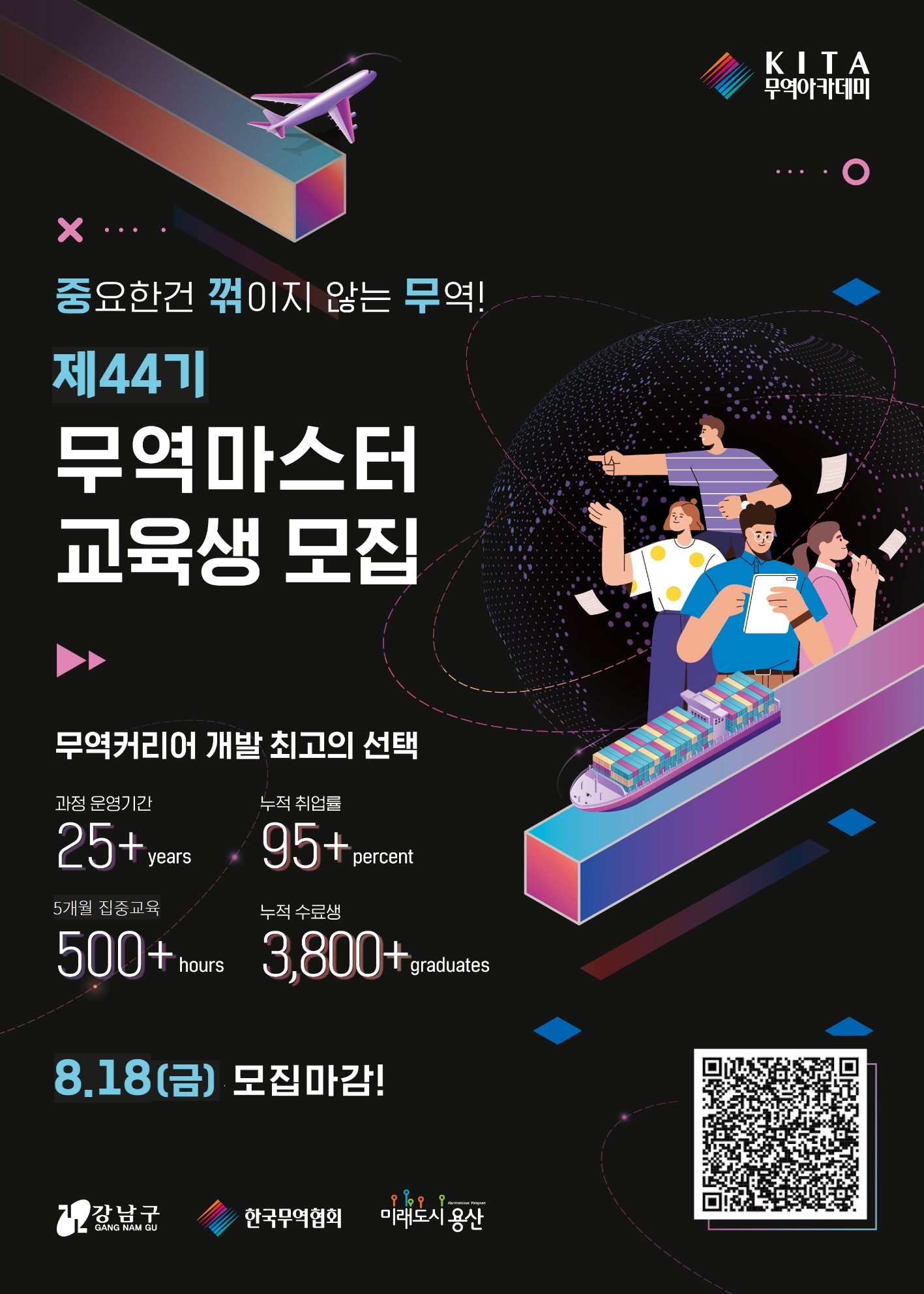 (사)한국무역협회 산하 일자리지원센터에서 <제44기 무역마스터 과정> 5개월(9.11일 시작) 간 운영하오니, 관심있는 분들의 많은 참여바랍니다.