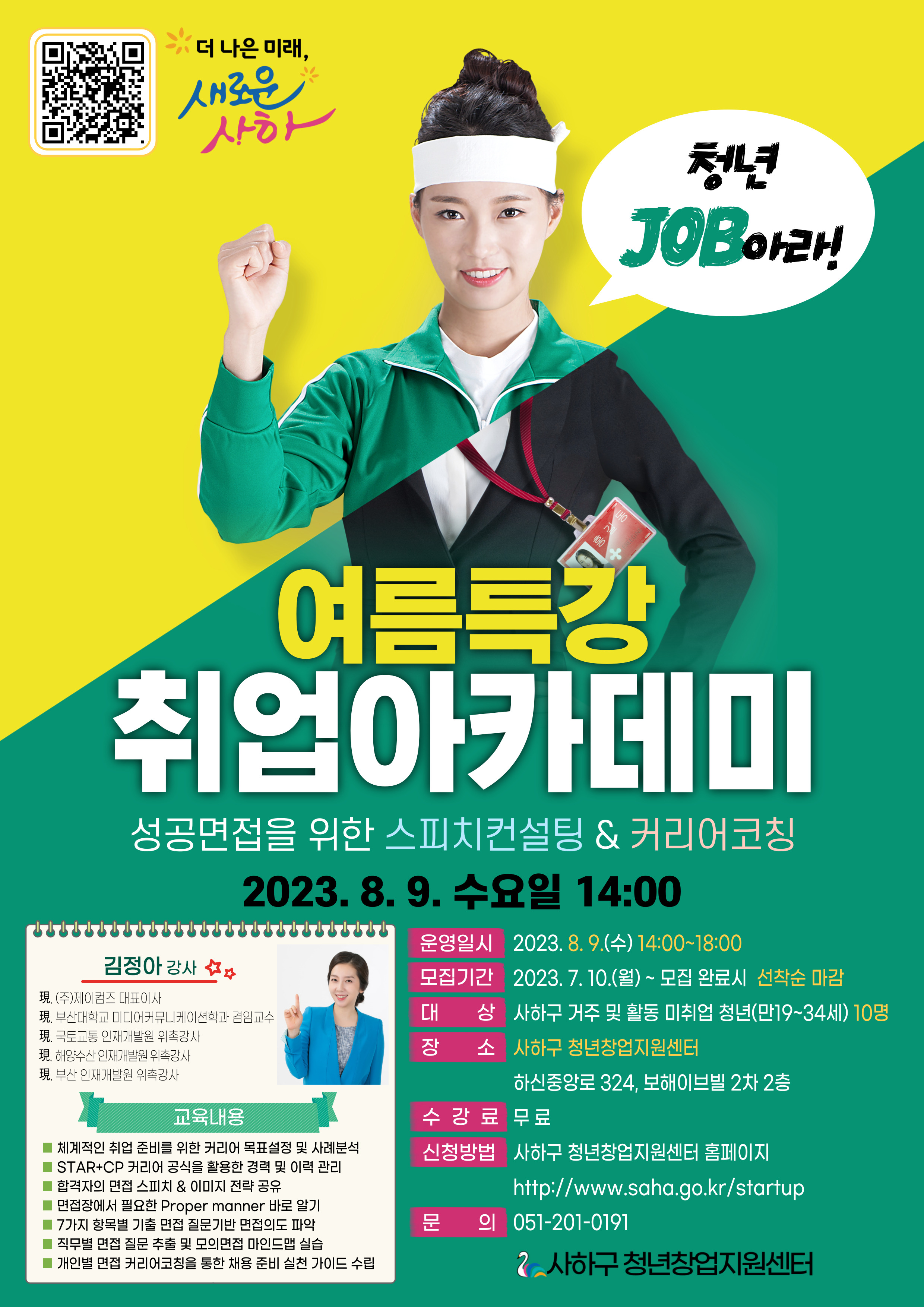 사하구 청년창업지원센터에서 청년 JOB아라!「취업 아카데미 여름특강」을 다음과 같이 운영하오니 관심있는 분들의 많은 참여 바랍니다.