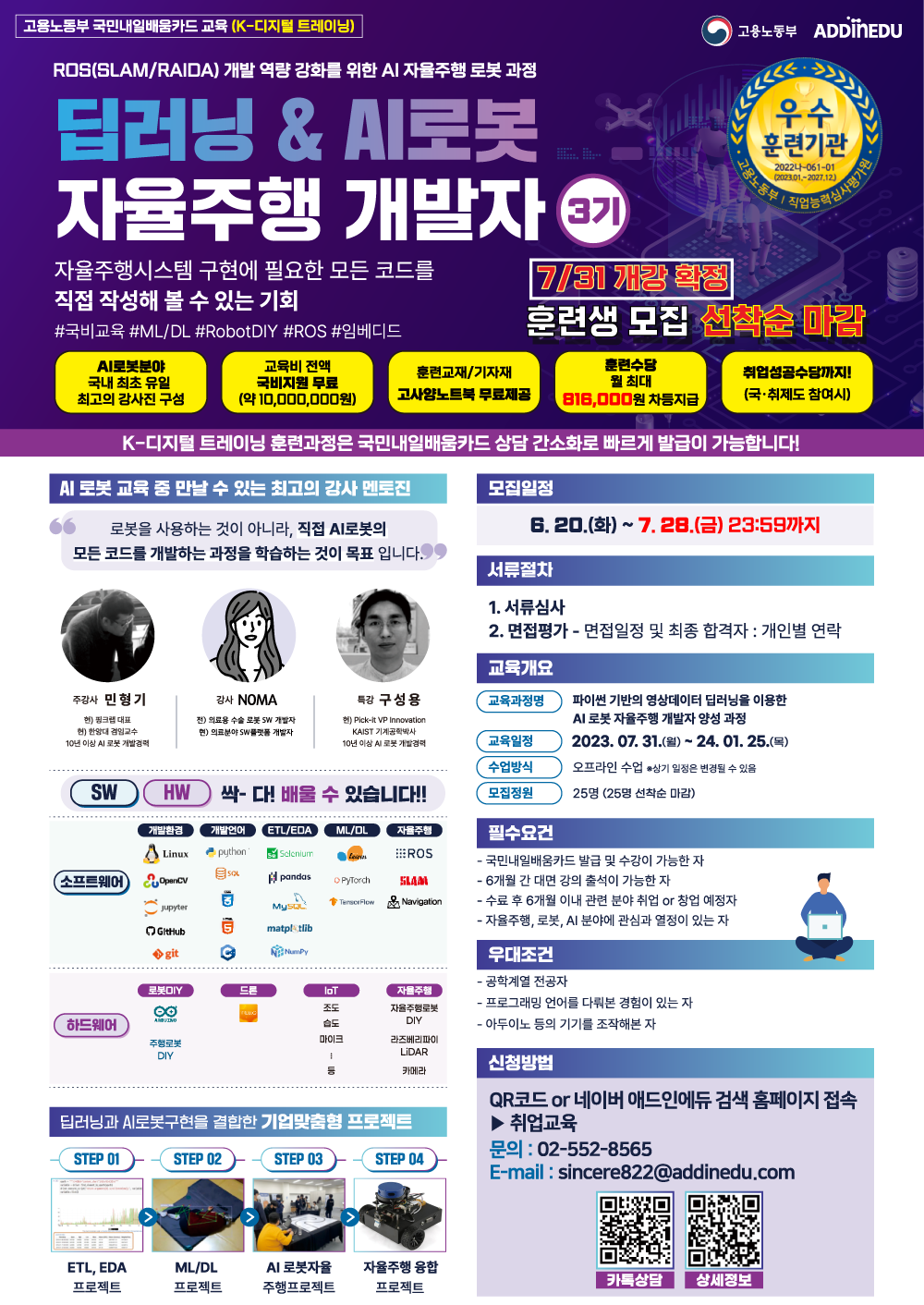 ● 훈련과정명 : ROS (SLAM/RAIDA) 개발 역량 강화를 위한 AI 자율주행 로봇 과정