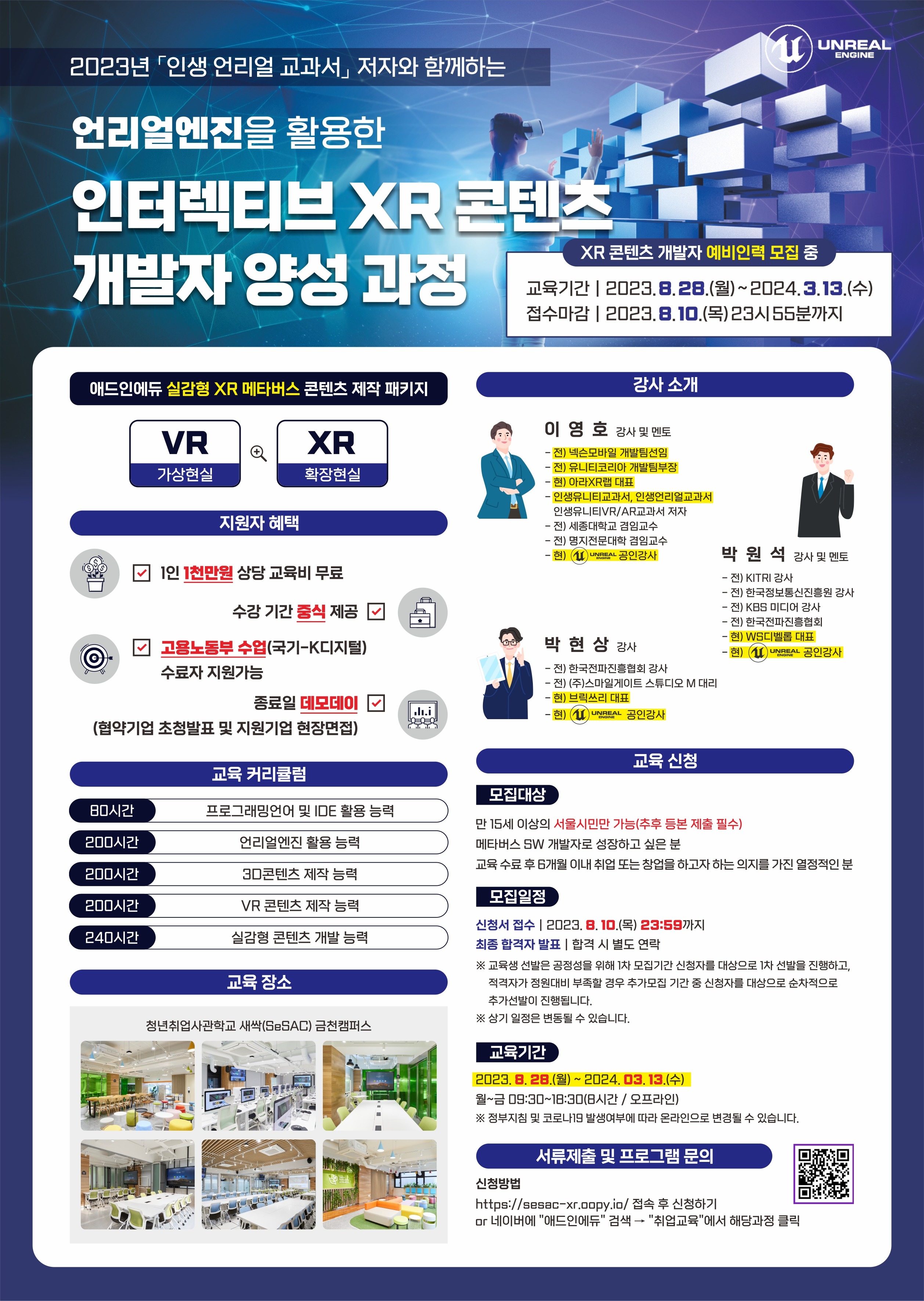 - 교육내용 : 언리얼이 제공하는 화려한 그래픽 기반의 VR을 기반으로 가상공간제작 XR 실감형 콘텐츠 개발