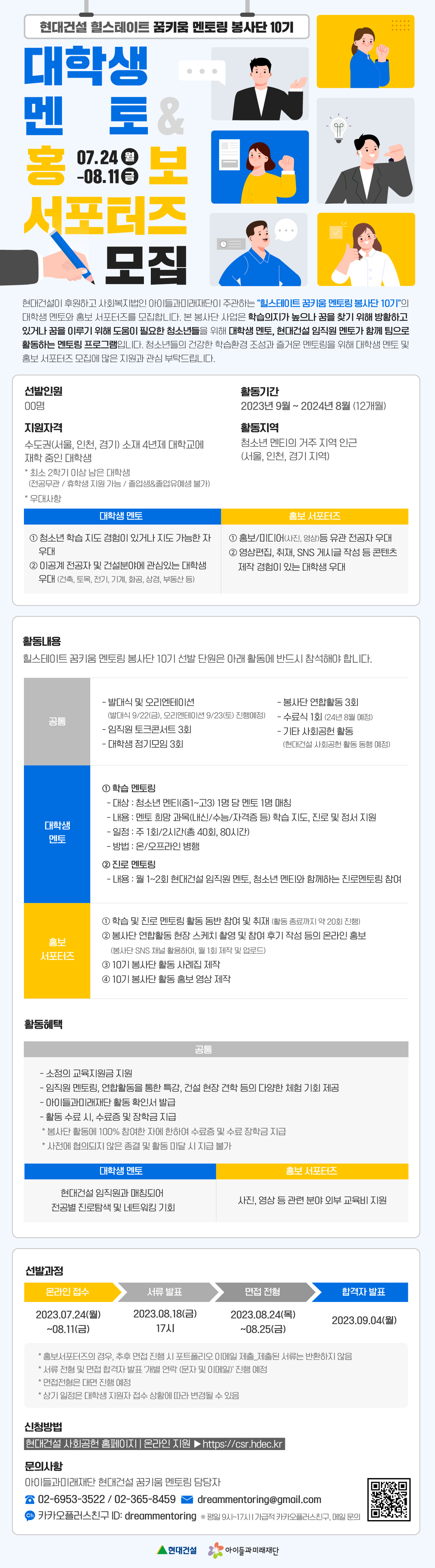 [현대건설] 힐스테이트 꿈키움 멘토링 봉사단 10기 대학생 멘토 & 홍보 서포터즈 모집 (~8/11)
