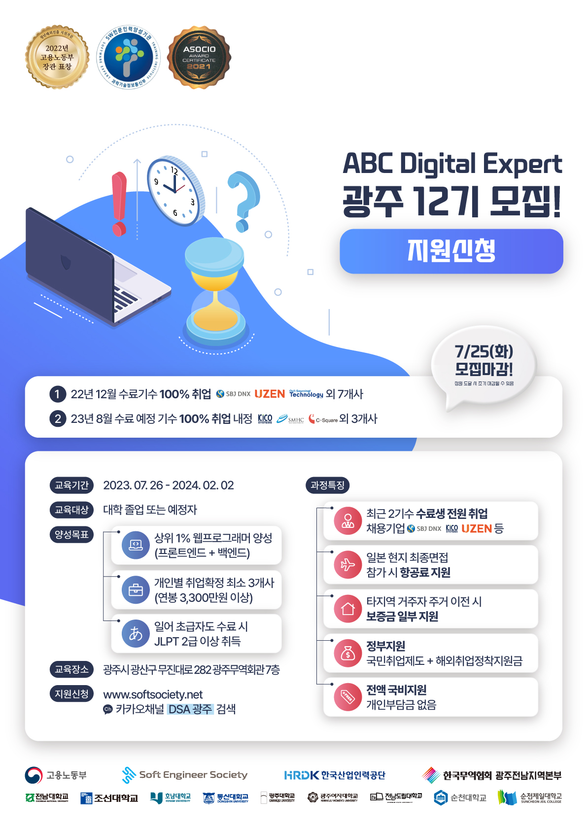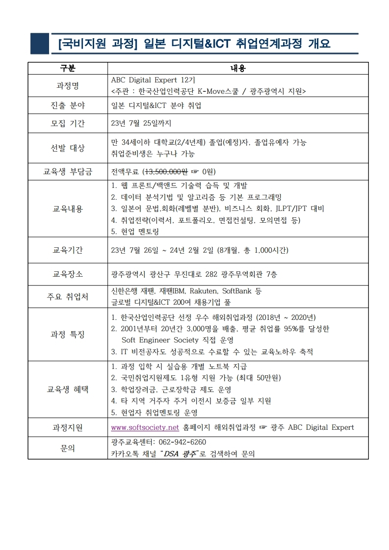 소프트엔지니어 소사이어티에서 4차 산업혁명시대의 디지털 전환을 주도하는 인재 양성을 목표로 해외 IT분야 진출을 돕는 한국산업인력공단의 K-MOME스쿨 해외취업 양성훈련을 모집하고 있으니, 관심있는 분들의 많은 지원 바랍니다.