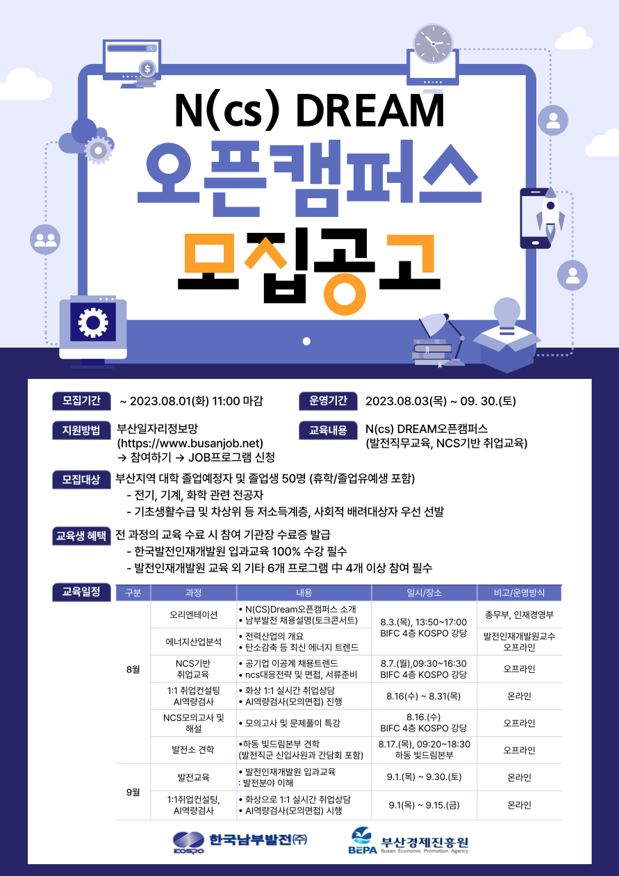 부산시와 부산경제진흥원에서 혁신도시 공공기관 지역인재 취업지원사업의 일환으로 진행하는 2차 공공기관 오픈캠퍼스의 교육생을 아래와 같이 모집하니, 관심 있는 학생들의 많은 참여 바랍니다.