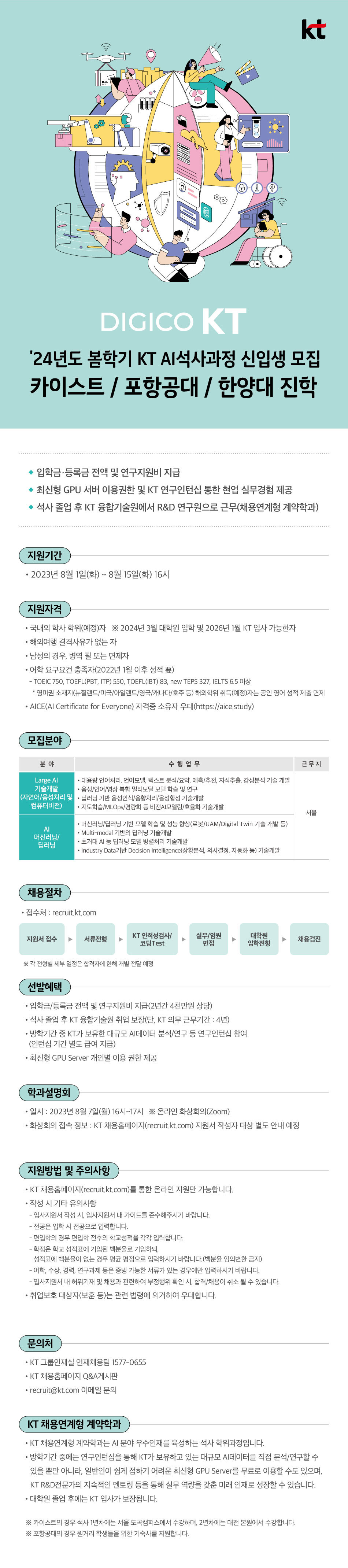 [KT] 2024년도 봄학기 AI 석사과정 (카이스트, 포항공대, 한양대 진학) 신입생 모집(~8/15)