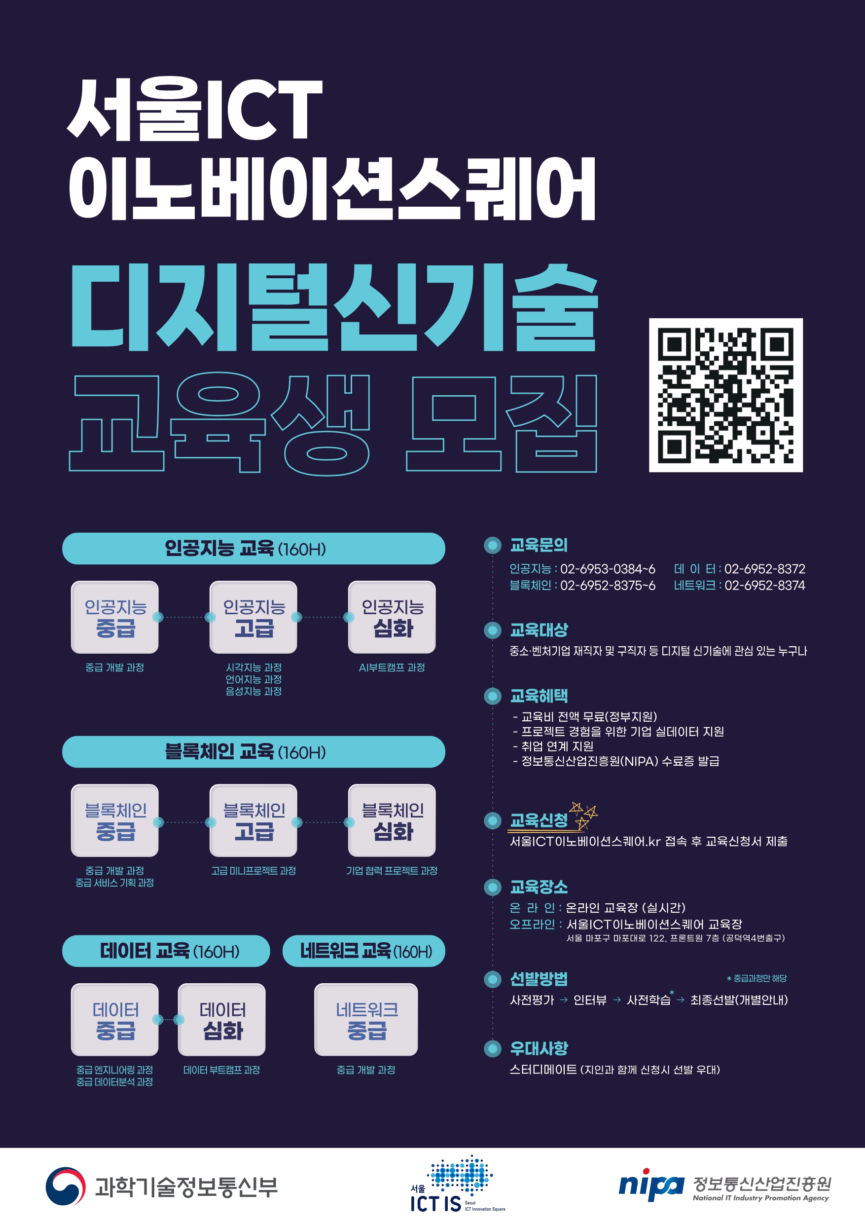 서울ICT이노베이션스퀘어는 과학기술정보통신부 주최, 정보통신산업진흥원이 주관하여 AI, 블록체인, 데이터, 네트워크 등 디지털 신기술 활용역량을 강화하기 위한 교육 및 실습, 프로젝트 등을 진행하는 실무형 전문인력 양성 과정입니다.