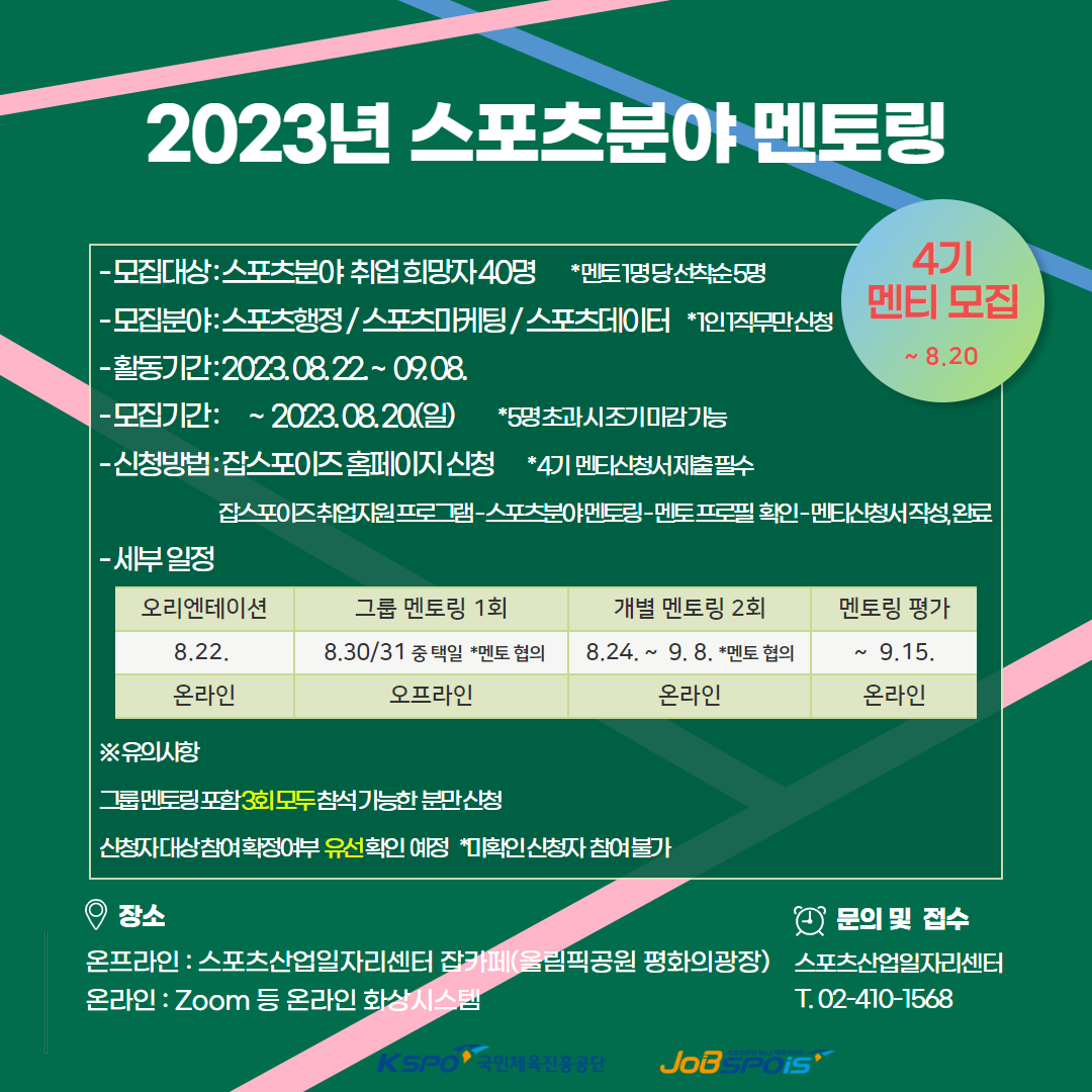 가. 모집대상: 스포츠분야 취업 희망자 40명(스포츠분야 멘토링 멘티 4기)