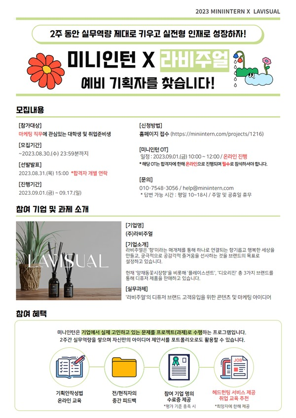라이브스타일 브랜드 ‘라비주얼’의 디퓨저 브랜드 고객 유입을 위한 전략을 수립하는 마케팅 직무 교육형 미니인턴 입니다.