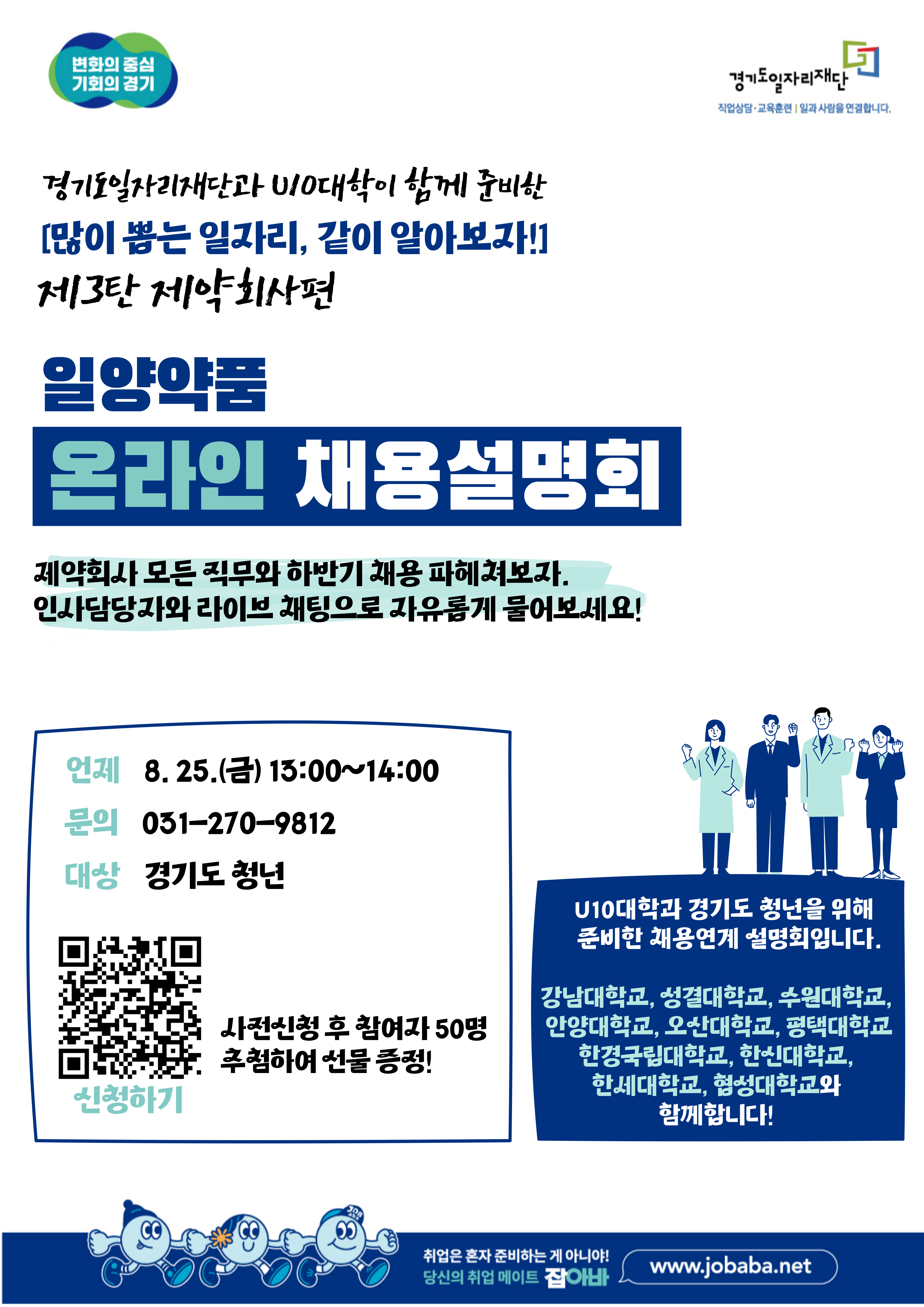 [경기도일자리재단] 「많이 뽑는 일자리, 같이 알아보자!」 제3탄 - 제약회사 온라인 채용설명회