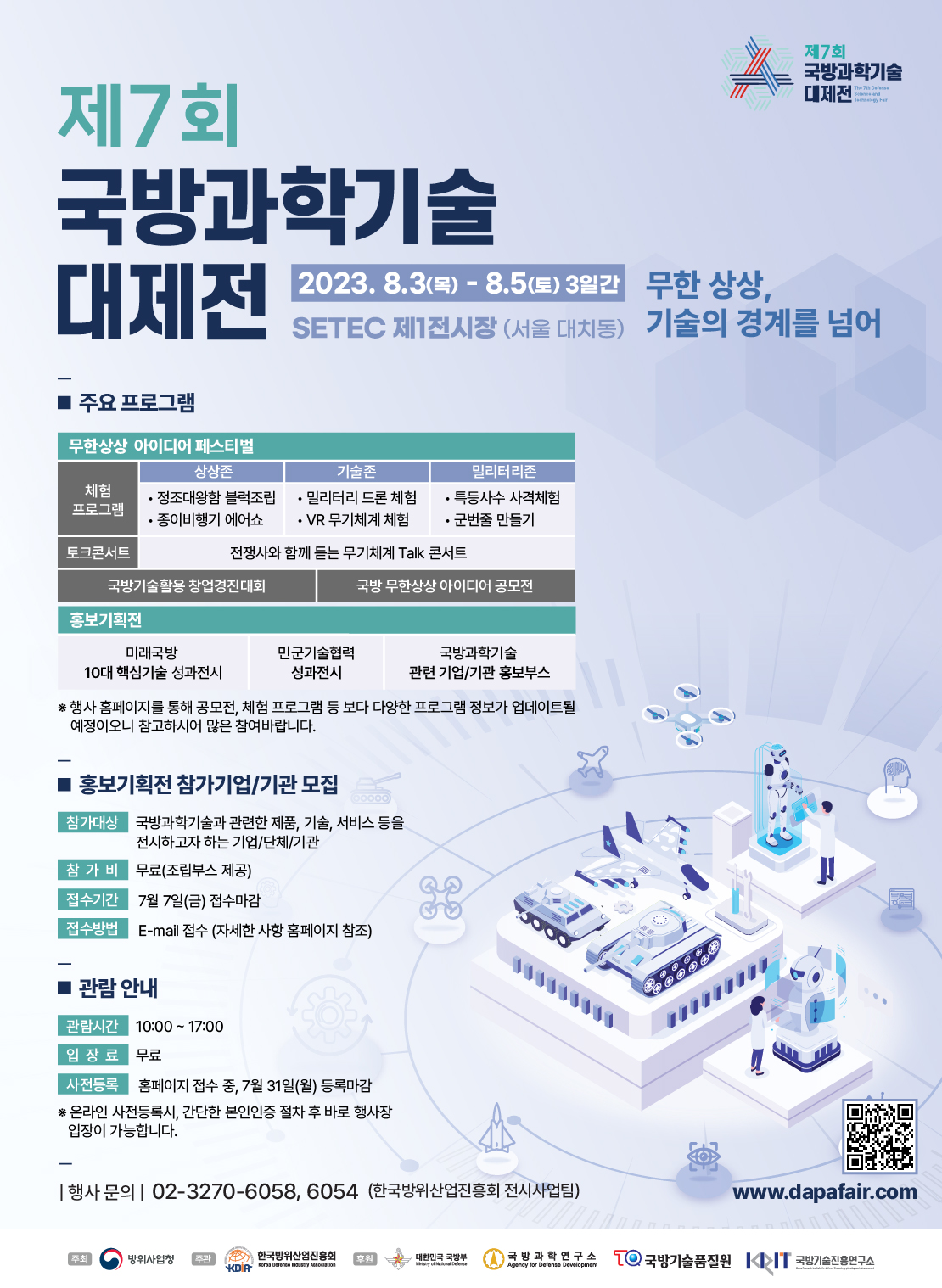 방위사업청에서 주최하는 제7회 국방과학기술대제전에 국방기술진흥연구소가 참가하여 채용 설명부스를 운영할 계획입니다. 국방 및 방위산업 분야에 관심있는 취업준비생들의 많은 참석 바랍니다.
